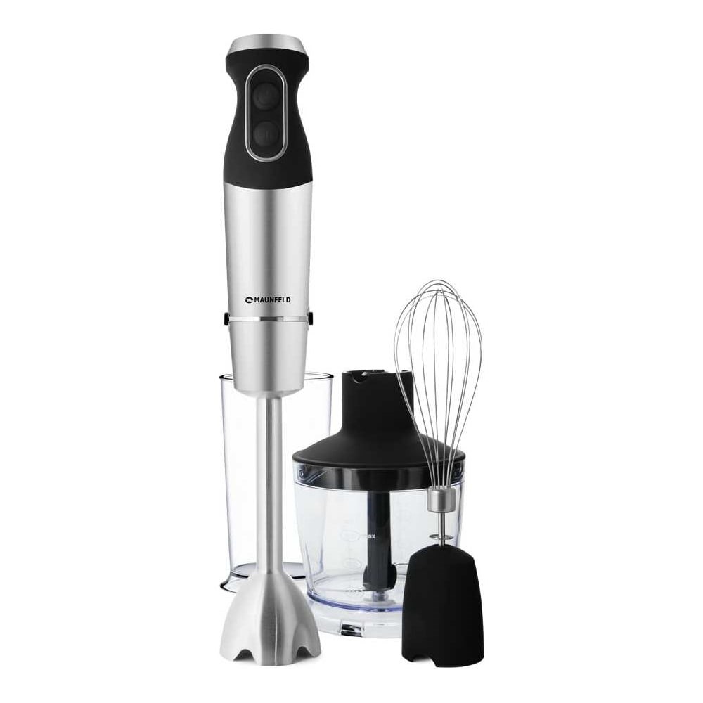 Погружной блендер обеспечивает экономное использование рабочего пространства. Идеальное соотношение цены и качества является дополнительным аргументом в пользу приобретения. Корпус выполнен из комбинации метала и пластика, соединённых резиновыми прокладками для надежного крепления. Мощность прибора равна 1000 Вт, этого достаточно для выполнения ежедневных бытовых задач. Объемы чаши и стакана составляют 0,5 и 0,6 л соответственно. Элементы управления оснащены светодиодной подсветкой повышенной яркости. Система облегченного крепления насадок создана для вашего удобства. Длина сетевого шнура 1,3 м. Две скорости позволят выбрать оптимальный крутящий момент для приготовления нужного вам блюда согласно рецепту. Низкий уровень шума особенно важен в домашнем использовании, чтобы не тревожить посторонними звуками домочадцев. Модель имеет опцию три в одном, то есть с помощью его вы можете взбивать, смешивать и измельчать, просто меняя насадки. Турбо-режим — это современная функция, благодаря которой за считанные секунды вы превратите орехи в крошку, или зерна в муку. Защита от перегрева продлевает срок службы устройства.