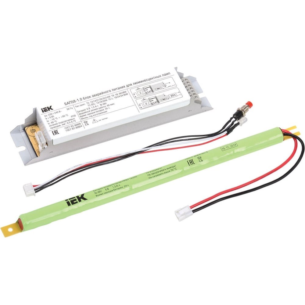Блок аварийного питания БАП58-1.0 для ЛЛ/КЛЛ IEK LLVPOD-EPK-58-1H 316734 предназначается для монтажа в светильник и поддерживания бесперебойной работы в аварийном режиме одной люминесцентной лампы. Устройство представляет собой сочетание электронного конвертера (пускорегулирующего аппарата), емкого и герметичного никель-металл-гидридного аккумулятора, тестовой кнопки, а также светодиодного индикатора подзарядки и наличия сети.
