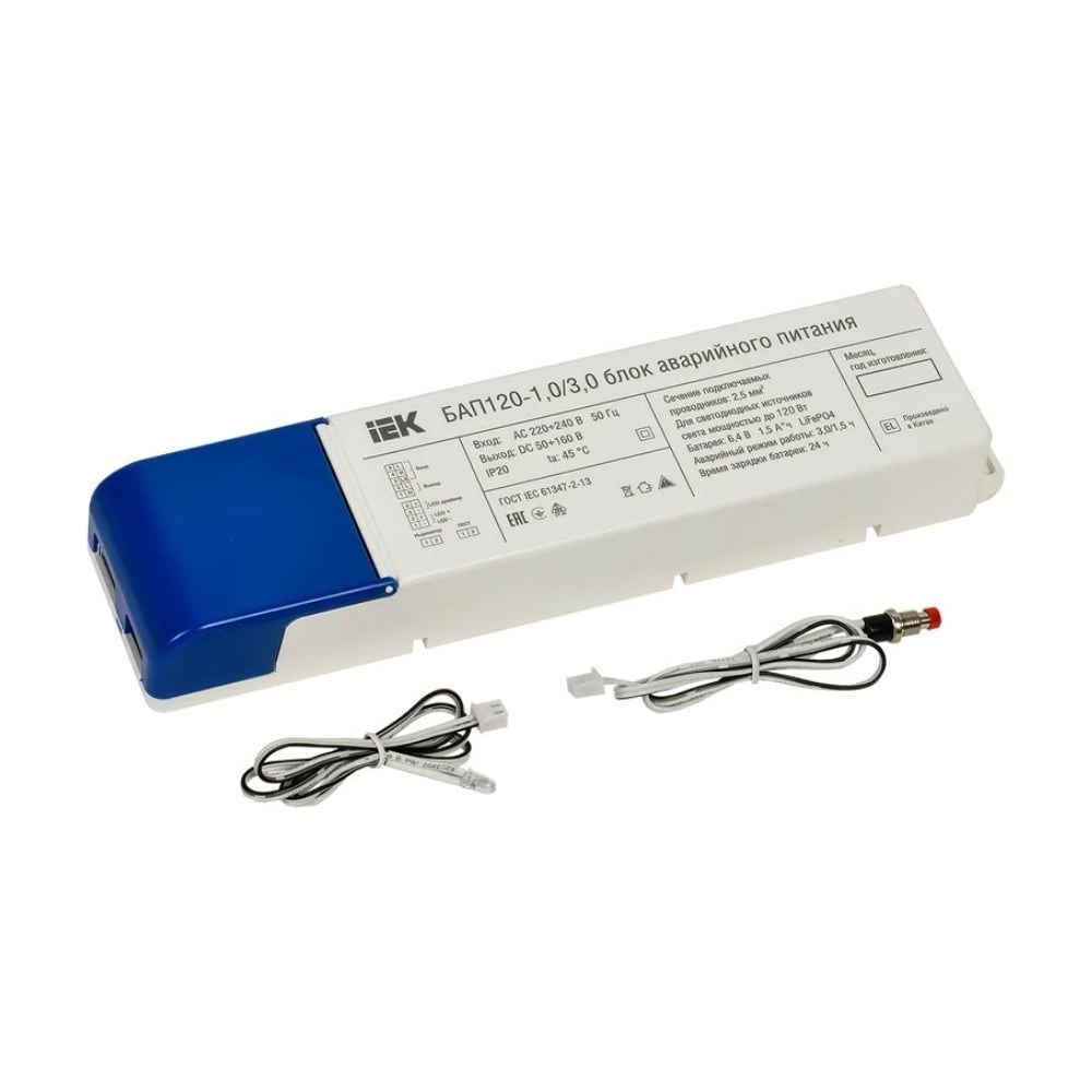 Блок аварийного питания IEK БАП120-1,0/3,0 совмещ. для LED LLVPOD-EPK-120-1H-3H предназначен для обеспечения бесперебойного освещения помещений светодиодными светильниками в случае непредвиденного отключения сети 230В или при снижении порогового значения. Встраивается в схему питания светильника. Обязательным условием является наличие доступа к драйверу, а также входное напряжение светодиодного модуля должно находиться в рабочем диапазоне выходных напряжений БАП 50-160В.