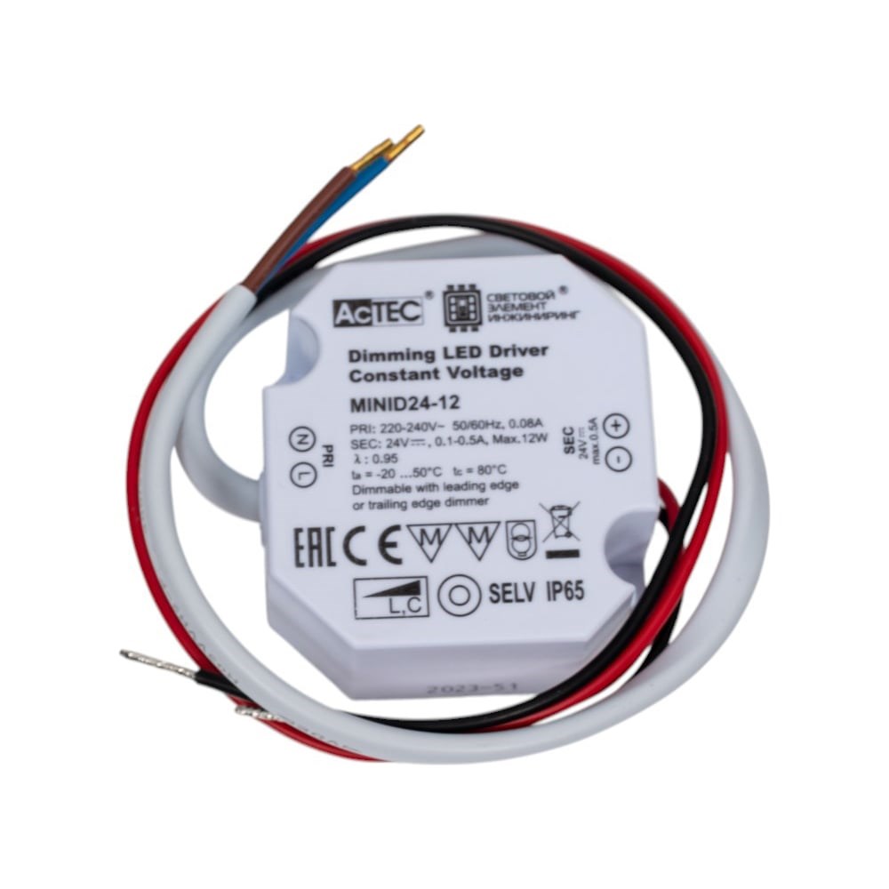Диммируемый блок питания AcTEC 24В, 12Вт, IP65, 0.1-0.5A, димм., Triac, 50x48x24мм MINID24-12 для светильников и светодиодов. Предусмотрена защита от обрыва, короткого замыкания, перегрузки и перегрева. Совместим с большинством диммеров. Диапазон регулирования яркости 1...100%.