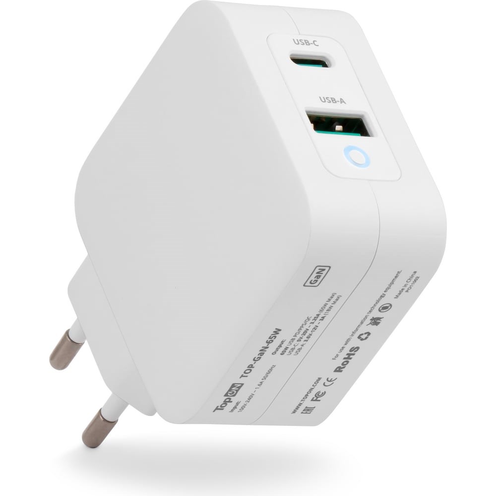 Блок питания TopOn GaN 65W Type-C PD, PPS, USB QC Белый TOP-GaN-65W подходит для зарядки и питания ноутбуков Apple Macbook, HP, Dell, Asus, Lenovo, Acer, Samsung, Xiaomi, смартфонов, планшетов, умных колонок, беспроводных Bluetooth-колонок, модемов, внешних аккумуляторных батарей и других цифровых устройств через универсальный порт USB-C. Технические характеристики: Мощность: 65W Технология: GaN (нитрид галлия) Входной ток: 100V-240V ~ 1.6A 50/60Hz Исходящий ток: USB-C: 5V-20V ~ 3.25A (65W Max) USB-A: 3.6V-12V ~ 3A (18W Max) USB-C + USB-A: 45W + 12W (57W Max)