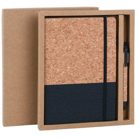 Подарочный набор включает в себя блокнот с внутренним блоком из 80 листов кремовой бумаги плотностью 70 г/м2. Благодаря классическому формату А5 (145х213 мм) блокнот удобно использовать как в офисе, так и на выездных деловых встречах. Твердая обложка выполнена из ЭКО материалов под кожу и пробковое покрытие. Блокнот оснащен резинкой-фиксатором, поэтому не откроется в сумке или портфеле и страницы не помнутся. Дополнениями являются закладка-ляссе и держатель для ручки. Шариковая ручка, со стильным корпусом из ЭКО пластика и материала под пробку также входит в набор.