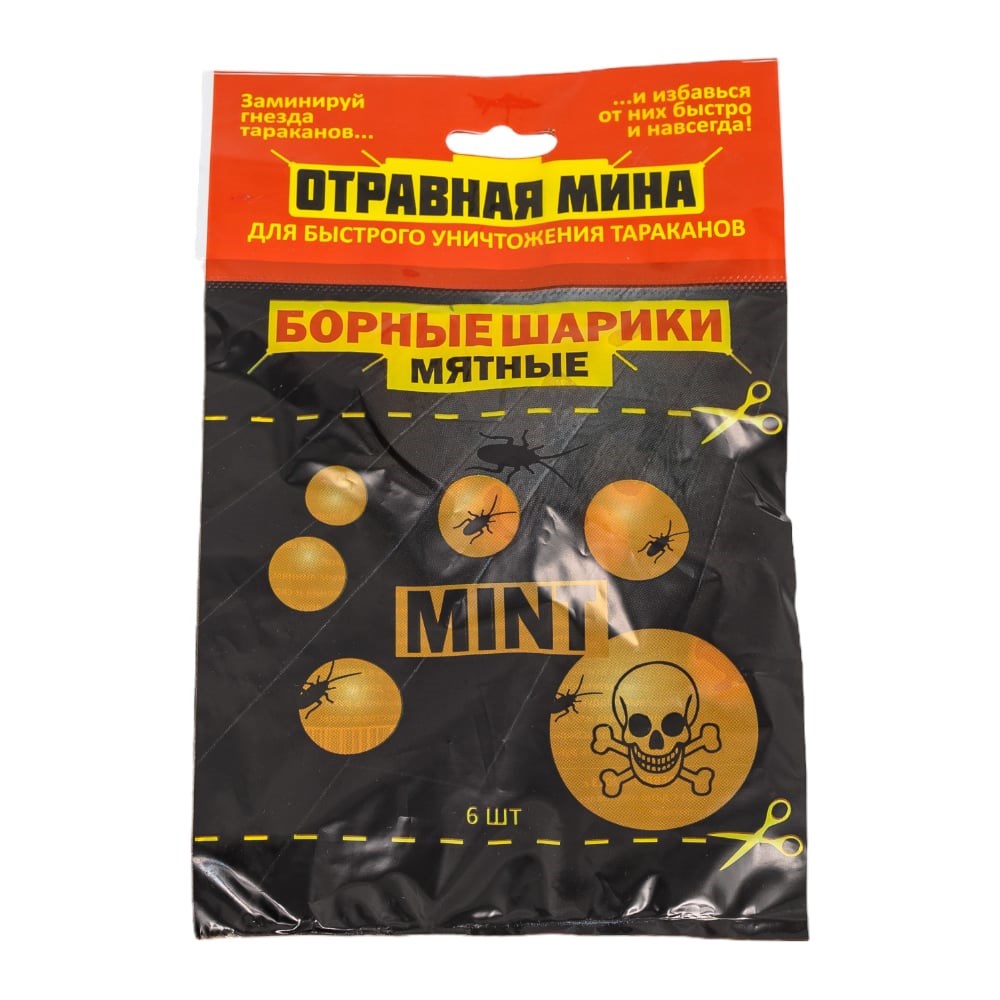 МИНА Отравная (ом) борные шарики мятные 21014 представляет собой эффективное и испытанное средство по борьбе с тараканами. Борная кислота усиливает действие фипронила. Так же в состав входит пищевая добавка - мята. Шарики размещаются в местах появления и передвижения насекомых.
