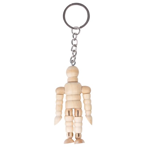 Деревянный брелок представляет из себя упрощенную модель человека, отдельные части которой скреплены между собой металлическими болтиками в тех местах, где сгибаются суставы. Высота - 7 см. Брелок возможно декорировать самостоятельно, тем самым создать собственный и неповторимый дизайн стильного аксессуара. Такой брелок станет модным решением в качестве держателя связки ключей.