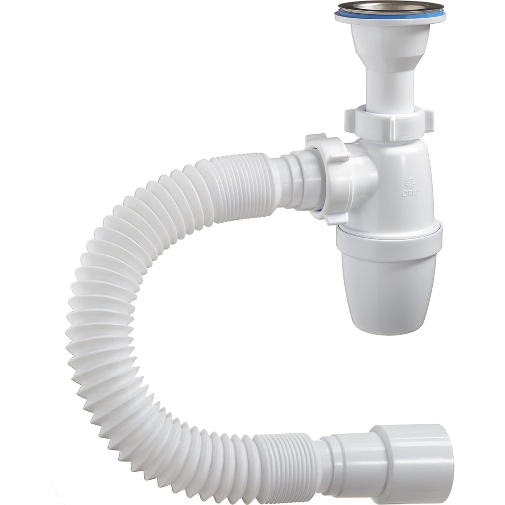 Бутылочный сифон ORIO малый корпус, с литым выпуском 1 1/2х40, с гибкой трубой 40-40/50 А-32019 с нержавеющей чашкой д.70мм и отводом в канализацию гибкой трубой 40-40/50. В комплекте идёт полированная нержавеющая чашка д.70мм. Сифон комплектуется нержавеющим винтом длиной 75мм и нержавеющей гайкой. Длина отвода в канализацию от 310 до 650мм. Отвод имеет два диаметра подключения к канализации 40 и 50мм.