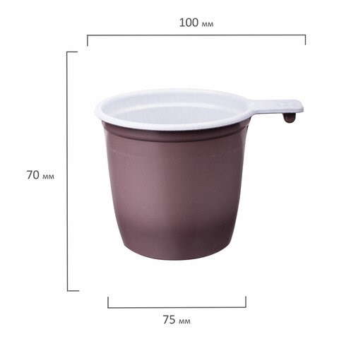 Изготовлены из экологически чистого полимера – полипропилена. Пригодны для использования в микроволновых печах. Чашки для чая и кофе объемом 200 мл предназначены для холодных и горячих (до +75 °C) напитков. Диаметр – 75 мм. Поставляются комплектом по 50 штук.