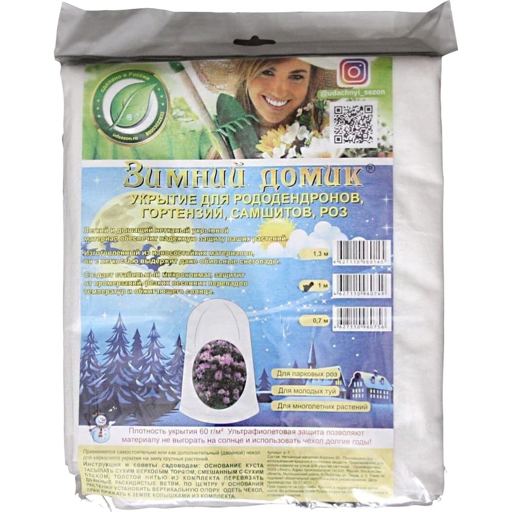 Укрытие-чехол для рододендронов Удачный сезон Зимний Домик 0.7 м 1025 подходит для укрытия цветов и других растений в зимний период. Надежность. Изготовлено из дышащего, устойчивого к износу и атмосферным условиям материала, который прослужит долгое время. Создает оптимальный микроклимат, защищает растения от заморозков, перепадов температур и солнца, предохраняет от потери влаги и парникового эффекта.