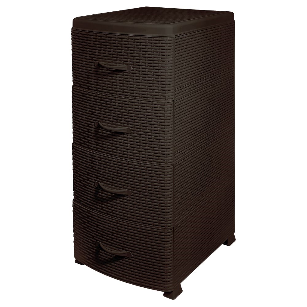 Четырехсекционный комод Violet Ротанг коричневый 35701 предназначен для хранения вещей, различных мелочей, принадлежностей, игрушек, косметики, аксессуаров или продуктов питания. Комод выполнен в стиле натурального плетения, гармонично впишется в интерьер любой комнаты. Легкий и вместительный, он поможет обеспечить порядок в квартире, доме или на даче. Комод этажерка прост в уходе и легко моется. Он подойдет для кухни, гостиной, спальни, детской, прихожей, гардероба или ванной. Можно использовать комод Violet как шкаф для вещей, органайзер для хранения с ящиками для канцелярских предметов или детских игрушек. Пластиковый комод имеет вместительные ящики контейнеры для хранения, благодаря которым можно сэкономить пространство. Комод легко собирается, доставляется в разобранном виде в индивидуальной коробке. Благодаря небольшому весу комод мобильный - его легко переставить в другое место. В отличие от большинства других комодов, комод Ротанг имеет боковые сплошные стенки, которые делают его более крепким, надежным и привлекательным.