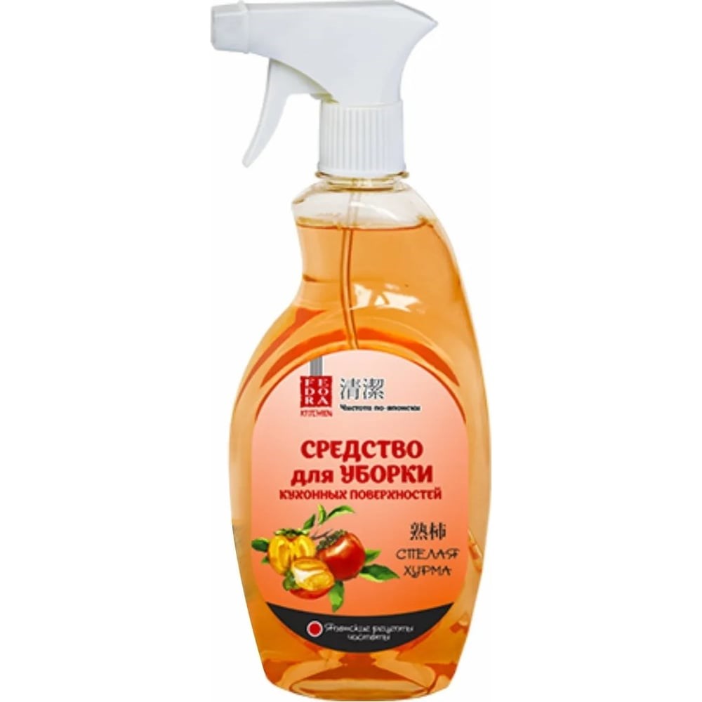 Чистящее средство для кухонных поверхностей Fedora спелая хурма 500 мл 507 удаляет жир, идеально очищает, легко смывается водой. Антибактериальные добавки, содержащие серебро и экстракт имбиря, способствуют усилению очищающего эффекта. Имеет экономичный расход, за счет чего средства хватит на долгий срок. Не содержит агрессивных веществ, благодаря чему не повреждает обрабатываемые материалы. Способ применения: Повернуть насадку распылителя в положение spray или stream, равномерно распылить средство с расстояния 15-25 см на очищаемую поверхность, смыть водой до полного удаления средства. Вытереть поверхность досуха. Вернуть насадку распылителя в положение off. При необходимости повторить обработку.