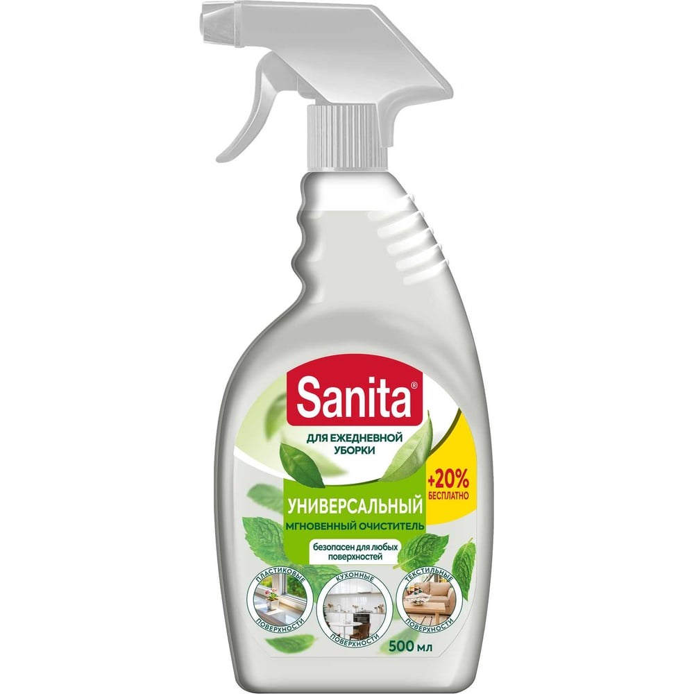 Универсальное чистящее средство-спрей для всех поверхностей и текстиля SANITA 500 мл 22719 имеет в своём составе биоразлагаемые ПАВ, которые глубоко проникают внутрь загрязнений и удаляют 100% пятен, справляются со стойкими загрязнениями и при этом безопасны для поверхностей, контактирующих с едой. Благодаря чистящей силе натуральных компонентов в составе деликатно очищает мебель, сантехнику, твердые поверхности на кухне, препятствует оседанию пыли, убирает грязь, отпечатки пальцев, следы жира, масляных пятен с текстильных поверхностей. Обладает антистатическим эффектом.