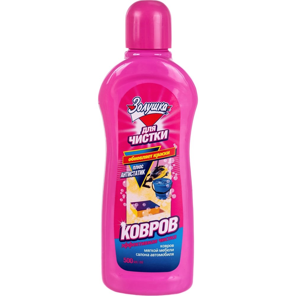 Средство для чистки ковров Золушка 500 мл Ч-16-3Это мощное средство не только эффективно удаляет пятна и грязь, но и освежает, дезодорирует и возвращает яркость красок вашим коврам и обивке мягкой мебели.С его помощью вы сможете легко ухаживать за ковровыми покрытиями, обивкой мягкой мебели и даже салонами автомобилей. Инновационная формула проникает в волокна, не повреждая их структуру, а антистатическая обработка снимает электростатический заряд, препятствуя накоплению пыли.Способ применения: Перед применением проведите сухую уборку пылесосом и протестируйте стойкость окраски ковра к воздействию средства на малозаметном участке. Приготовьте рабочий раствор из расчета 60 мл (4 колпачка) средства на 4 л теплой воды. Взбейте с помощью губки плотную пену, нанесите ее на ковер и почистите щеткой или губкой, стараясь сильно не увлажнять поверхность. После высыхания обработайте ковер пылесосом.