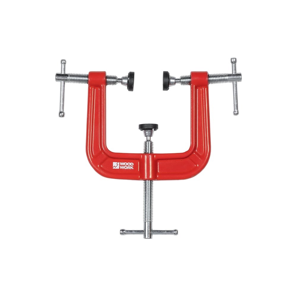 Трехвинтовая С-образная струбцина трехсторонняя из ковкого чугуна прилагает поперечное усилие к кромке или боковой стороне заготовкиСтрубцина кромочная применяется в мебельном производстве для сжатия кромок изделий при склеивании, фиксации обрамлений или раскладок до схватывания клеяС помощью трехстороннего зажима для кромки также можно отремонтировать молдинг, декоративную отделку, кромку столешницы или полоски шпонаОснащена тремя винтовыми зажимами с шаровидными шарнирами на прижимной площадкеЗащитный пластиковый колпачок