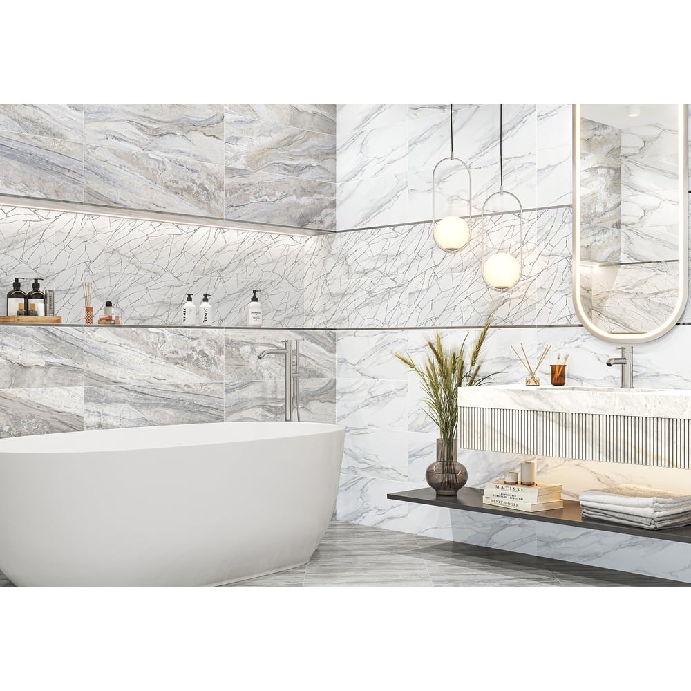 Коллекция Alicante с глянцевой поверхностью рекомендована для облицовки стен ванной комнаты и санузла. Ректифицированный край позволяет сделать укладку с минимальным швом. Голубая Калакатта с теплыми прожилками и многоцветный индонезийский мрамор с глубокой текстурой дополняют друг друга и сочетаются между собой по тональности. Акцентным элементом коллекции выступает витиеватая сетка из белого золота с мерцающим глиттером. Этот декор стыкуется и создаёт в интерьере современный разноразмерный узор, который переливается и играет от лучей света, направленных на него.