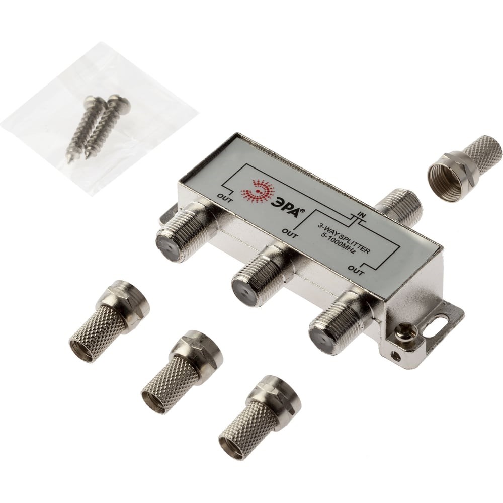Дополнительные технические характеристики делителя ЭРА ТВ DF05 3 ответвления под F разъем, в комплекте 4 F разъема, 5-1000 МГц Б0048324: Количество входов - 1. Количество выходов - 3. Способ подключения - F-разъем.