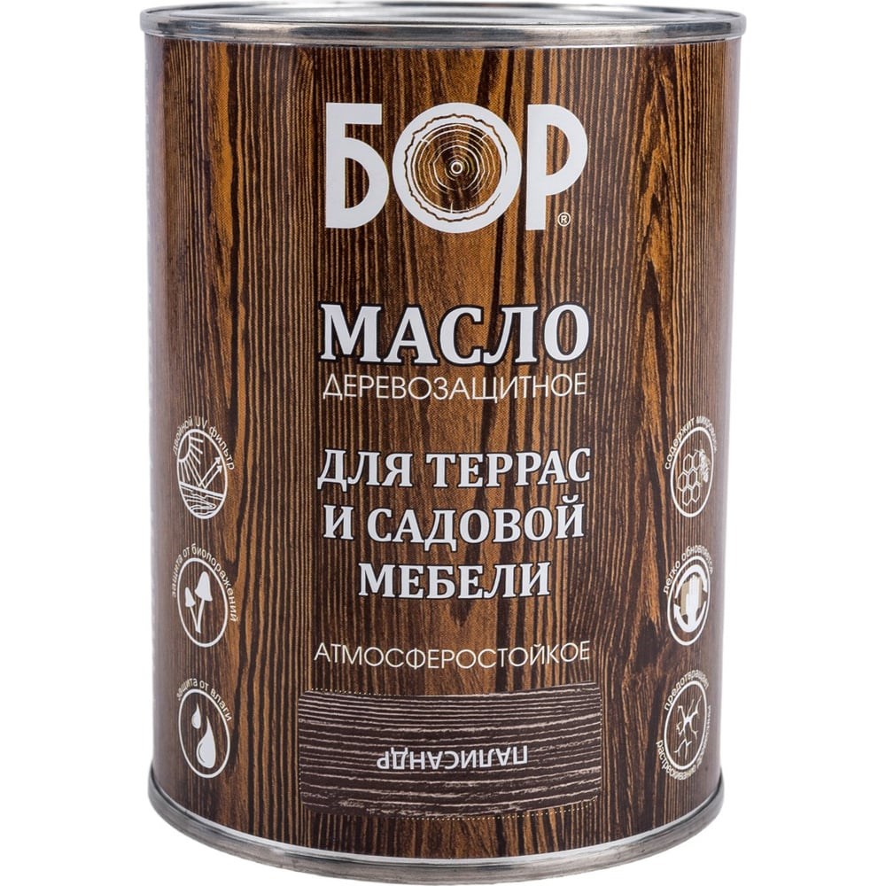 МАСЛО ДЕРЕВОЗАЩИТНОЕ ДЛЯ ТЕРРАС И САДОВОЙ МЕБЕЛИ I БОР Лессирующее деревозащитное покрытие на основе натурального льняного масла. Образует шелковисто-матовое износостойкое покрытие , устойчивое к мытью и перепадам температур. ПРЕИМУЩЕСТВА · Защищает деревянную поверхность от выгорания и старения · Препятствует набуханию и растрескиванию · Обработанная маслом поверхность отталкивает воду и грязь · Предотвращает появление плесени и синевы · Защищает древесину от насекомых-вредителей · Покрытие со временем не шелушится · Легко обновляется. Достаточно повторно нанести некоторое количество масла на участки, требующие обновления. ПОДГОТОВКА ПОВЕРХНОСТИ Поверхность высушить, тщательно отшлифовать, очистить от пыли и провести контрольное нанесение на небольшом участке. Качество шлифовки влияет на впитывающие свойства масла и внешний вид обработанного участка. Древесину хвойных деревьев, очистить тканью, смоченной в уайт-спирите и выдержать до полного испарения растворителя. Поверхности, поврежденные грибком плесени и синевы, следует обработать специальными составами. Ветхую древесину отшлифовать до ее здорового слоя. Ранее промасленную древесину для обновления очистить от загрязнений, слегка зашлифовать. Содержание влаги в древесине не должно превышать 18%. ПОДГОТОВКА МАСЛА Масло готово к применению и не требует разбавления. Перед применением и во время использования масло необходимо перемешивать.
