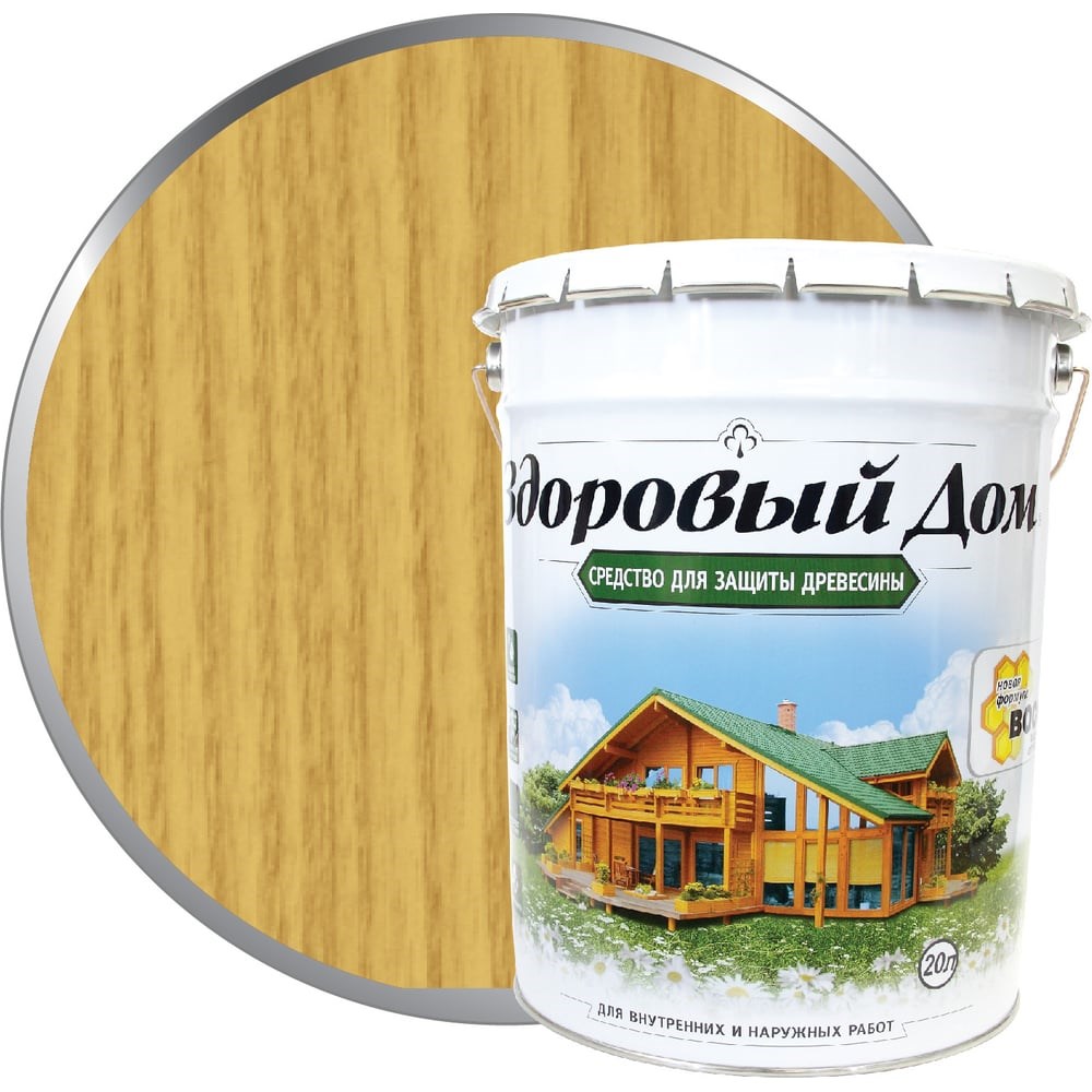 Деревозащитное средство Здоровый дом сосна, 20 л 90000857524 - высокоэффективное средство для защиты и декоративной отделки древесины. Применяется для покрытия внутренних и наружных стен, балконов, перил, плинтусов, лестниц, заборов, садовых строений, фасадов домов, срубов, оконных рам и других конструкций из дерева, фанеры, ДСП и ДВП. Благодаря составу, продукт защищает от влаги, ультрафиолетовых лучей и других атмосферных воздействий. Антисептические добавки обеспечивают надежную защиту деревянной поверхности от насекомых-вредителей, препятствует гниению, образованию плесени и древесной синевы. Средство подчеркивает естественную красоту текстуры дерева. Расход: пиленая древесина 5-8 кв. м/л, строганая древесина 10-14 кв. м/л.