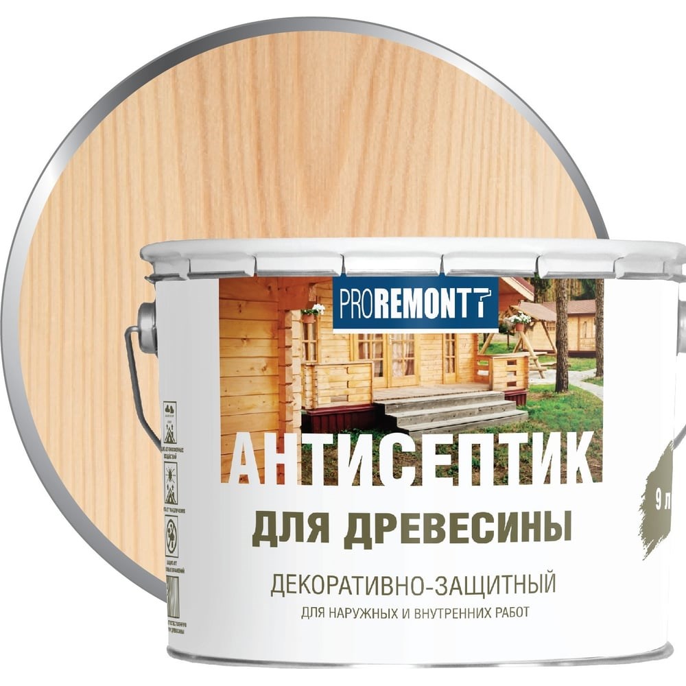 Антисептик Proremontt деревозащитное средство бесцветный 9 л Лк-00004608 можно использовать для обработки поверхностей из дерева как внутри, так и снаружи помещения. Средство обеспечивает эффективную защиту от образования плесени, грибка, от негативного влияния атмосферных явлений и выгорания на солнце. Применение состава гарантирует сохранение натуральной текстуры древесины.