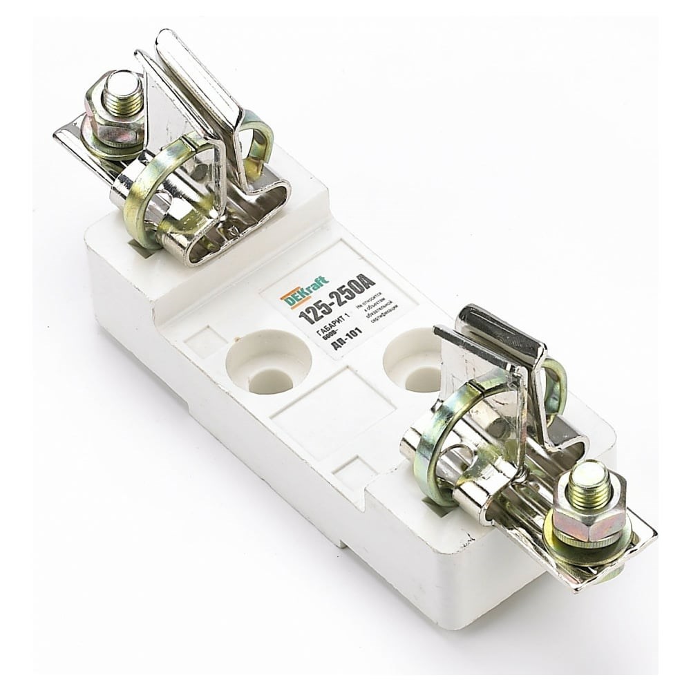 Держатель ножевого предохранителя серии ДП-101 Dekraftтип 35габарит 00номинальный ток до 250 АПредохранители ножевые применяются в однофазных и трехфазных сетях переменного тока, напряжением до 660 В, частотой 50 Гц. Держатель устойчив к механическим и термическим воздействиям, а также динамическим ударам при коротких замыканиях.