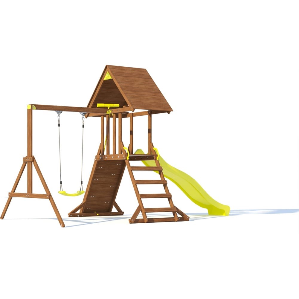 Детский игровой комплекс, детская площадка MoyDvor МойДвор Крепость свободы 10304 10 со скалодромом, горкой и качелями отлично подходит для организации детского досуга на свежем воздухе. Компактная и в то же время функциональная детская площадка позволит одновременно играть вместе целой группе детей. Благодаря продуманной конструкции игрового комплекса с широкой лестницей с поручнями, ограждению форта и деревянной крыше, защищающей от солнца и небольших осадков, малыши могут активно проводить время в полной безопасности. Детская площадка изготовлена из цельной древесины сосны, тщательно просушенной и обработанной пропиткой против гниения и насекомых. Дополнительные характеристики: Размер - 4100х2300х2650 мм Высота платформы форта - 1120 мм Размер платформы форта - 640х1350 мм Длина ската горки - 2200 мм. Внимание! Цвет горки в ассортименте: желтый, синий, красный.