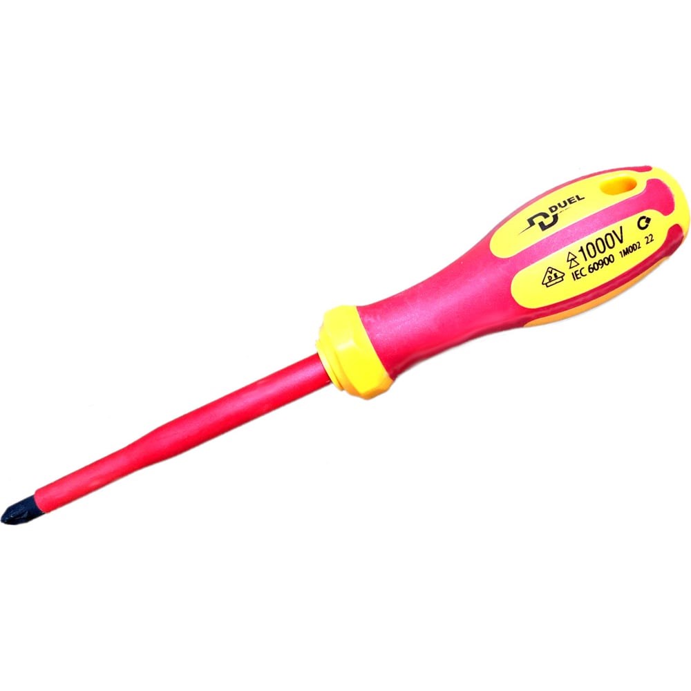 Диэлектрическая отвёртка DUEL соответствует стандарту 1000V IEC-60900. Диэлектрическое покрытие отвёртки, позволяет работать под переменным напряжением до 1000В или под постоянным напряжением до 1500В. Универсальный шлиц MOD2 совмещает в себе SL6 и PZ2, болты с таким шлицем часто встречаются в автоматах, розетках выключателях и прочих электро приборах. Изготовлена из сверхпрочной стали, что делает инструмент надежным и долговечным. Наконечник покрыт чёрной оксидной плёнкой. Эргономичная рукоять служит для комфортной эксплуатации.