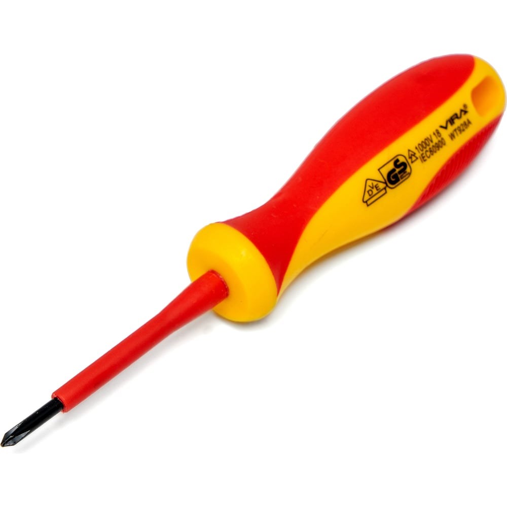 Отвертка диэлектрическая RAGE by VIRA: Назначение: откручивание и закручивание резьбовых крепежей со шлицом, находящихся под электрическим напряжением или вблизи токоведущих проводников; Тип шлица: PH0 (3 мм); Длина жала: 60 мм; Крутящий момент: 3,1 н/м; Материал жала: S2; Рукоятка: TPE+PP; Общая длина: 160 мм; Max напряжение: 1000V; СЕРТИФИКАТ: VDE 40050390, GS; СТАНДАРТЫ: IEC 60900, АС 1000V. Диэлектрическая отвертка предназначена для ремонтных, монтажных и демонтажных работ. Геометрия жала соответствует промышленным стандартам. Стержень имеет диэлектрическое покрытие. Резино-пластиковый материал на рукоятки предохраняет ладонь от проскальзывания и обеспечивают мягкость на ощупь. Отвертка сертифицирована немецкими стандартами качества VDE и GS. Знак VDE (Verband Deutscher Elektrotechniker), что является документальным подтверждением безопасности электроинструмента. Широкий выбор ручных инструментов для любых целей RAGE by VIRA - доверьтесь качеству: RAGE не подведет!