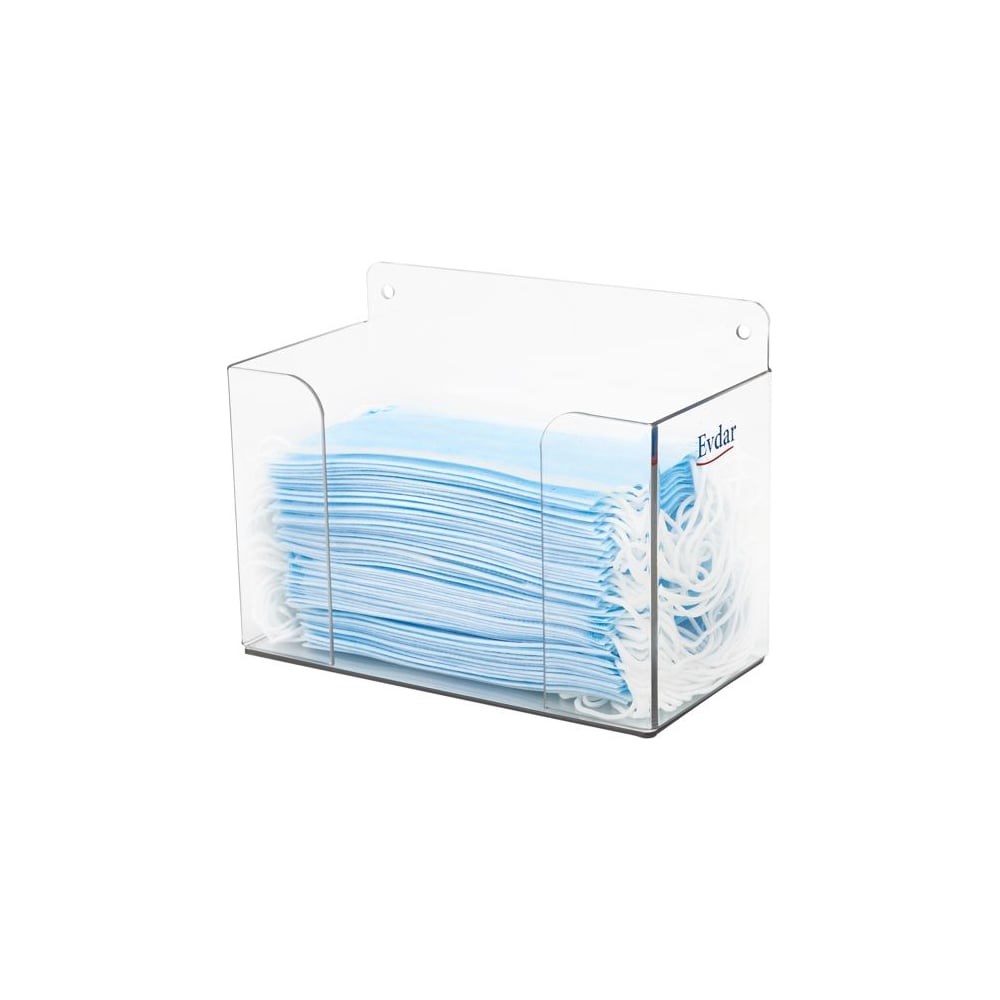Диспенсер для масок Evdar D1000 изготовлен из ударопрочного прозрачного пластика - поликарбонат.  В отличие от оргстекла: устойчив к любым спиртосодержащим дезинфицирующим жидкостям и со временем не трескается, не становится мутным. по мере эксплуатации не наэлектризовывается.