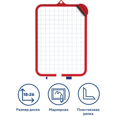 Доска для рисования двусторонняя с маркером и губкой 185х260 мм, клетка, подвес, ПИФАГОР, 236897