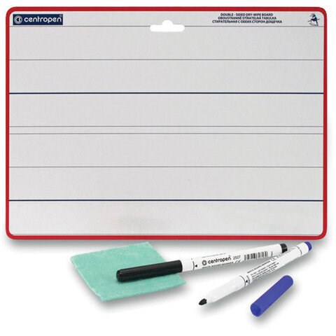 Двусторонняя маркерная доска формата А4 с расчерченными линиями строк и нижними вспомогательными линиями. В комплекте есть 2 маркера для доски и салфетка для удаления надписей.