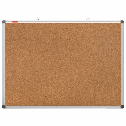 Поверхность изготовлена из натуральной пробки. Имеет улучшенную алюминиевую рамку и укрепленные пластиковые уголки. Размер доски - 90х120х1,8 см. Цвет покрытия - коричневый. Возможность горизонтального и вертикального размещения доски. Крепится к стене, элементы крепления входят в комплект.