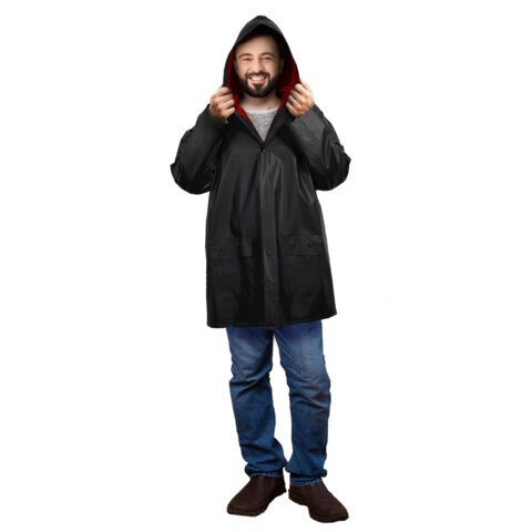 Дождевик-куртка универсального размера с капюшоном изготовлена из плотного водозащитного материала – поливинилхлорида (PVC). Застегивается на 4 пары кнопок из полипропилена (PP). В капюшоне есть кулиска с пластиковыми наконечниками. Карманы с влагозащитными клапанами на кнопках. Рукава сужаются книзу. Края рукавов, полочек и низ изделия подогнуты и надежно проклеены. Супер-прочный и стойкий материал. Для многоразового использования.