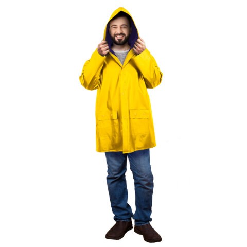 Дождевик-куртка универсального размера с капюшоном изготовлена из плотного водозащитного материала – поливинилхлорида (PVC). Застегивается на 4 пары кнопок из полипропилена (PP). В капюшоне есть кулиска с пластиковыми наконечниками. Карманы с влагозащитными клапанами на кнопках. Рукава сужаются книзу. Края рукавов, полочек и низ изделия подогнуты и надежно проклеены. Супер-прочный и стойкий материал. Для многоразового использования.
