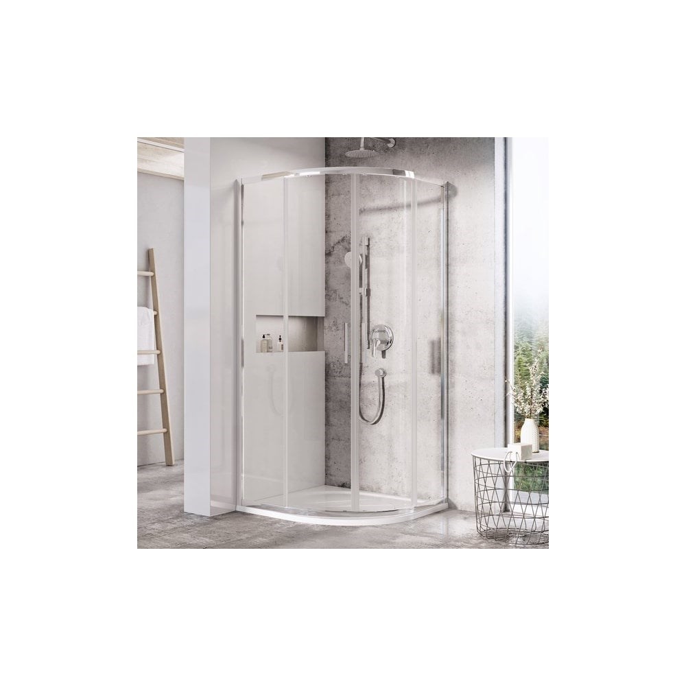 Материал профиля - алюминий. Цвет дверей - прозрачное стекло. Ширина входа - 48.5 см. Регулируемая ширина. Габариты с регулировками - 78.6-80х80х195 cм. Состоит из двух прямых неподвижных частей и двух изогнутых частей, образующих раздвижные двери.