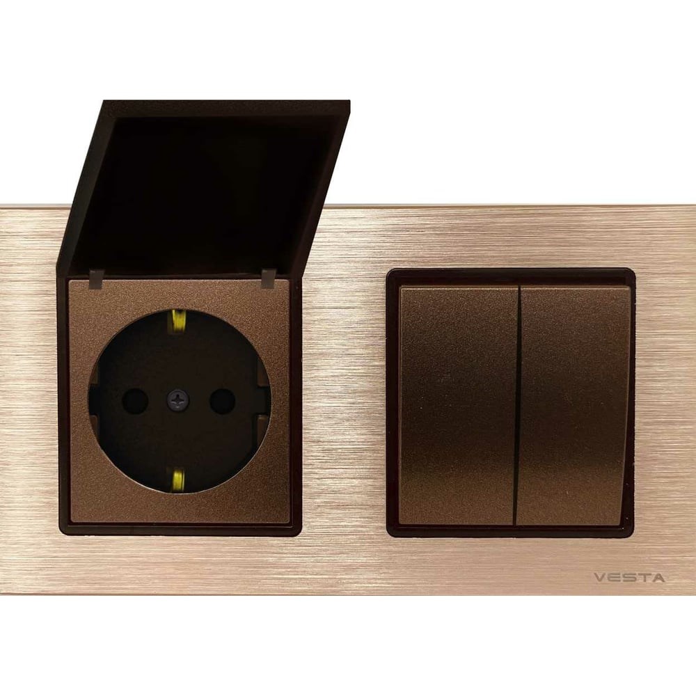 2-клавишный выключатель + розетка с заземлением с крышкой Metronex Electric Комплект-2, Exclusive Champagne FRM050208BSH в рамке из чистого алюминия цвета шампань. Механизмы можно вынуть из рамки и поменять порядок как самих розеток и выключателей, так и изменить их на горизонтальное, либо вертикальное расположение. Контакты механизмов изготовлены из чистой меди с серебряным покрытием, что гарантированно защищает от залипания и образования дуги, а в сочетании с абсолютно негорючим, термостойким пластиком последнего поколения, защитит дом от одной из частых причин возгорания в бытовых помещениях. Гарантия на все изделия 5 лет! Блок выключатель + розетка с заземлением с крышкой. Идеален для установки на кухне, в ванных комнатах, на уровнях близких к полу. Крышка герметично и надёжно защищает механизм от влаги и загрязнений. Для установки блока необходимо 2 стандартных круглых подрозетника.