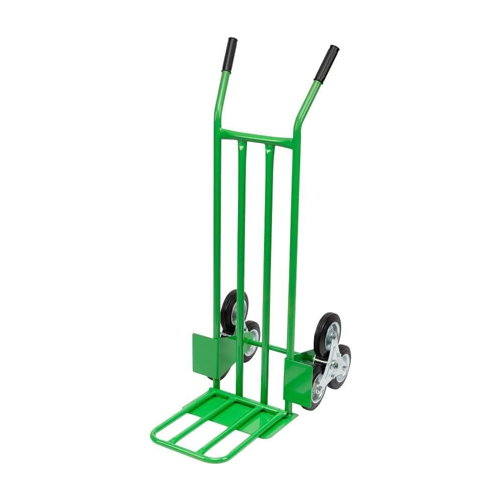 Конструкция тележки имеет прочный стальной каркас, площадку и дополнительную откидную платформу. В комплект тележки входят 2 блока по 3 колеса, облегчая транспортировку грузов по ступенькам. Тележка пригодится для работы на складе или на производстве.