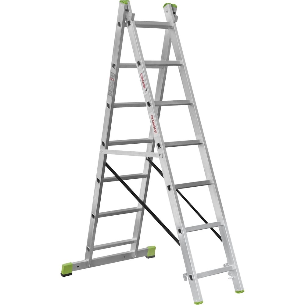 Двухсекционная алюминиевая лестница Новая Высота 2х7 ступеней 2220207 предназначена для краткосрочных работ и частного применения. Модель может использоваться как: приставная лестница, приставная раздвижная лестница, стремянка. Лестница сделана из экструдированного алюминия, что обеспечивает высокую прочность при лёгком весе. Двухкомпонентный пластик на наконечниках траверсы, обеспечивает большое (1200 мм²) пятно контакта, что предотвращает скольжение и повреждение поверхности. Алюминиевая стяжка в положении «Стремянка» создает жёсткую конструкцию и фиксирует рабочее положение, что обеспечивает безопасность во время использования.