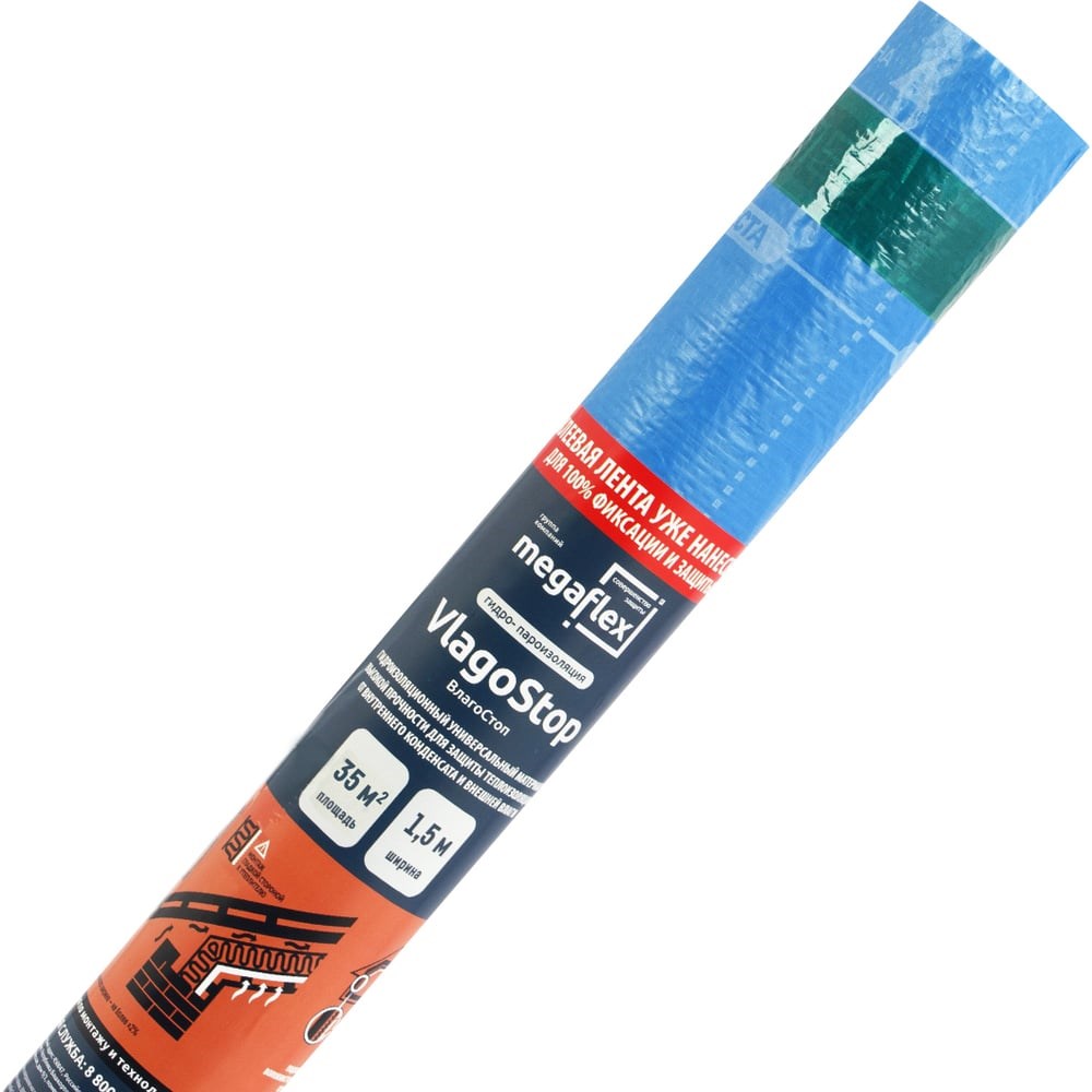 Гидро-пароизоляционная двухслойная пленка Megaflex VlagoStop D ш 1.5, 35 м2 с одной клеевой лентой MFVST.150.35 – это двухслойная гидро- и пароизоляция для усиленной защиты стен, потолка и крыши с одной клеевой лентой. Особенности плёнки VlagoStop Назначение VlagoStop – утепление помещений, где образование пара выше среднего уровня. Пленка обладает высокой водоупорностью и прочностью на разрыв. Самоклеящиеся полосы плёнки VlagoStop обеспечивают быструю водонепроницаемую укладку внахлёст, без лишних потерь материала. Предназначение: Применяется для паро- и гидроизоляции теплоизоляционного слоя и внутренних элементов конструкции кровли, стен и перекрытий от влаги, дождя, снега, ветра и пыли. Подходит для гидроизоляции неутепленной кровли из металла, черепицы, шифера и пр. Улучшает теплозащитные свойства утеплителя и защищает конструкцию дома. Монтируется гладкой стороной к утеплителю. Может временно выполнять функции укрывного материала. Простой и быстрый монтаж: Удобная разметка и инструкция на полотне позволяют избежать ошибок неправильного монтажа. Надежная герметизация с одной клеевой полосой Экономьте время и финансы до 20%. Одна клеевая лента по краю плёнки, с верхней стороны, заменяет скотч при скреплении полотен и помогают монтировать быстрее традиционных мембран даже в условиях сильного ветра. Можно использовать при температурах - 50..+80 ⁰С. На открытом солнечном свете стабильна к УФ-излучению в течение 3-4 месяцев.