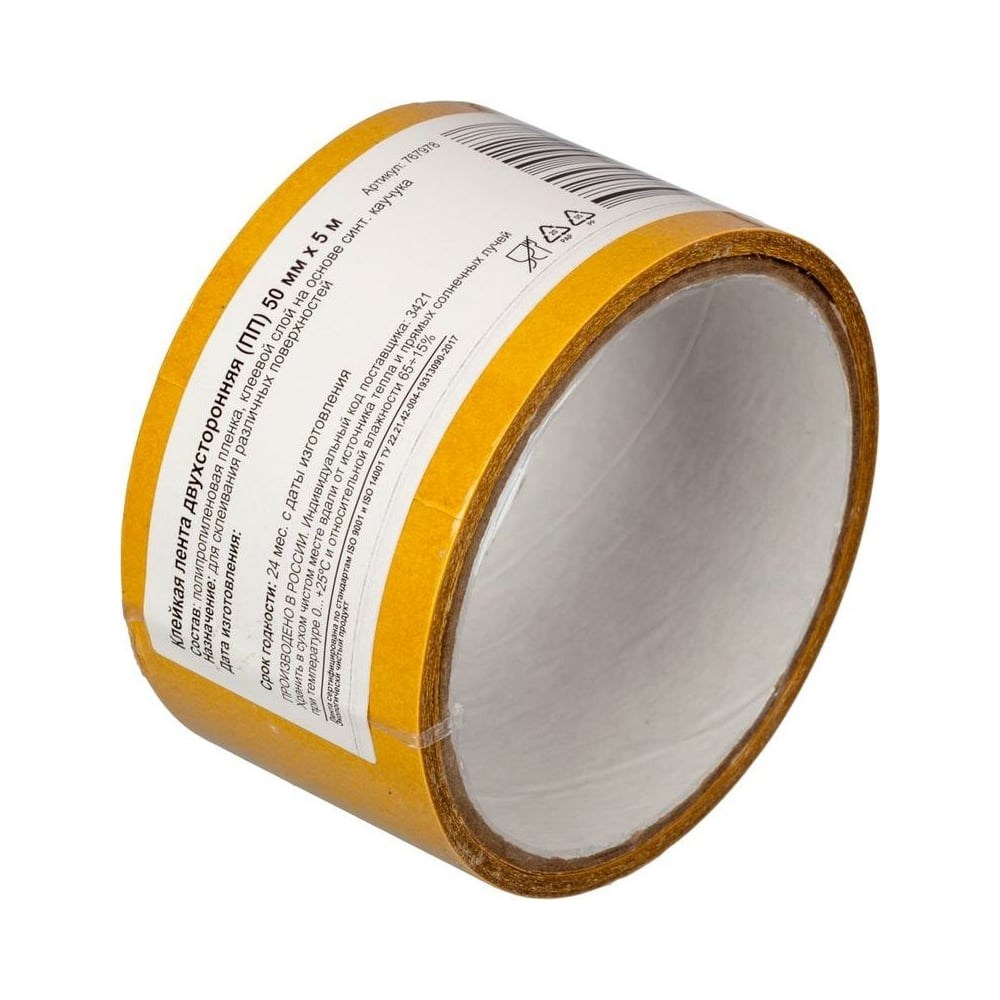 Двухсторонняя клейкая лента ООО Комус 50 мм х 5 м, полипропилен 767978 используется для склеивания гладких поверхностей и материалов при проведении монтажных, ремонтных, дизайнерских и оформительских работ. Клеевой слой на основе синтетического каучука. Максимальный вес прикрепляемого предмета - 85 г.