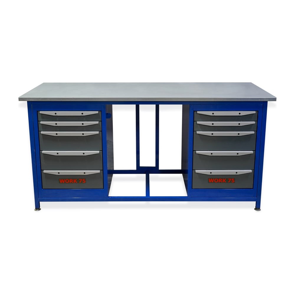 Двухтумбовый верстак WORK серии WK1800(Т5-Т5) используется для рациональной организации рабочего места при проведении различных сборочных и ремонтных операций. Верстак поставляется в разобранном виде, за исключением тумб, которые поставляются полностью собранными. Каркас верстака состоит из двух опор, верхней и нижней рам, а также рамки жесткости, изготовленных из стальной профильной трубы 30х30 мм. Каркас собирается с помощью стандартных болтов М8. Порошковое покрытие каркаса обеспечивает защиту от коррозии и долгий срок службы. Тумбы верстака комплектуются пятью выдвижными ящиками двух типоразмеров по высоте. Ящики фиксируются механизмом центрального замка и могут запираться на навесной замок. Выдвижение ящиков осуществляется с помощью телескопических шариковых направляющих (типа развернутый подшипник) с креплением на зацепах. Вариант крепления направляющих на зацепах позволяет избежать наличия выступающих частей заклепок на внутренних поверхностях выдвижных ящиков, что важно при использовании покупных ложементов для укладки инструмента в ящике. Максимальная распределенная нагрузка на ящик 45 кг. В стенках тумб установлены жесткие упоры, предотвращающие выпадение нагруженных ящиков при резком выдвижении ящика в крайнее положение «на себя». Столешница изготовлена из фанеры 24 мм и закрыта стальным оцинкованным листом стали толщиной 1,2 мм. Максимальная распределенная нагрузка на столешницу до 350 кг.
