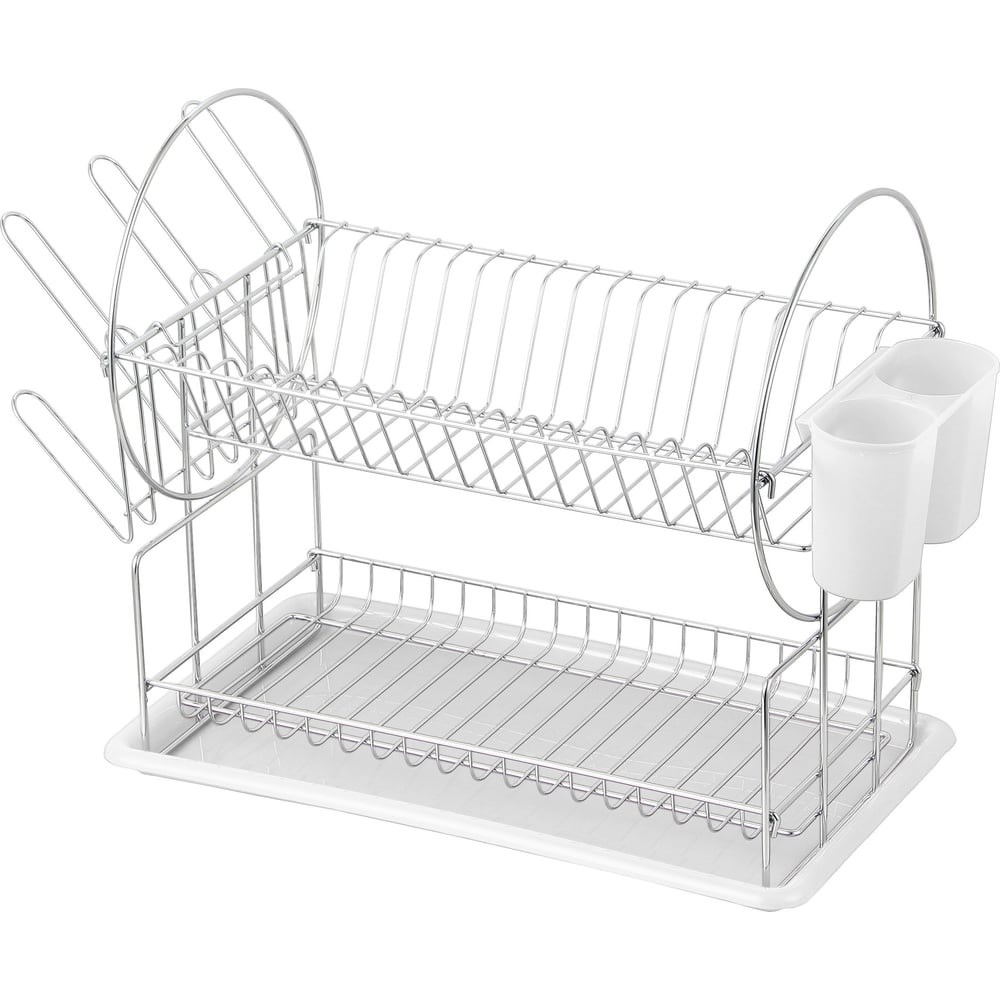 Сушилка для посуды двухуровневая настольная ТМ Рыжий кот. Дополнена пластиковым поддоном и пластиковыми емкостями для сушки столовых приборов. Размер в собранном виде: 50х23х36 смМатериал: хромированный металл, пластик