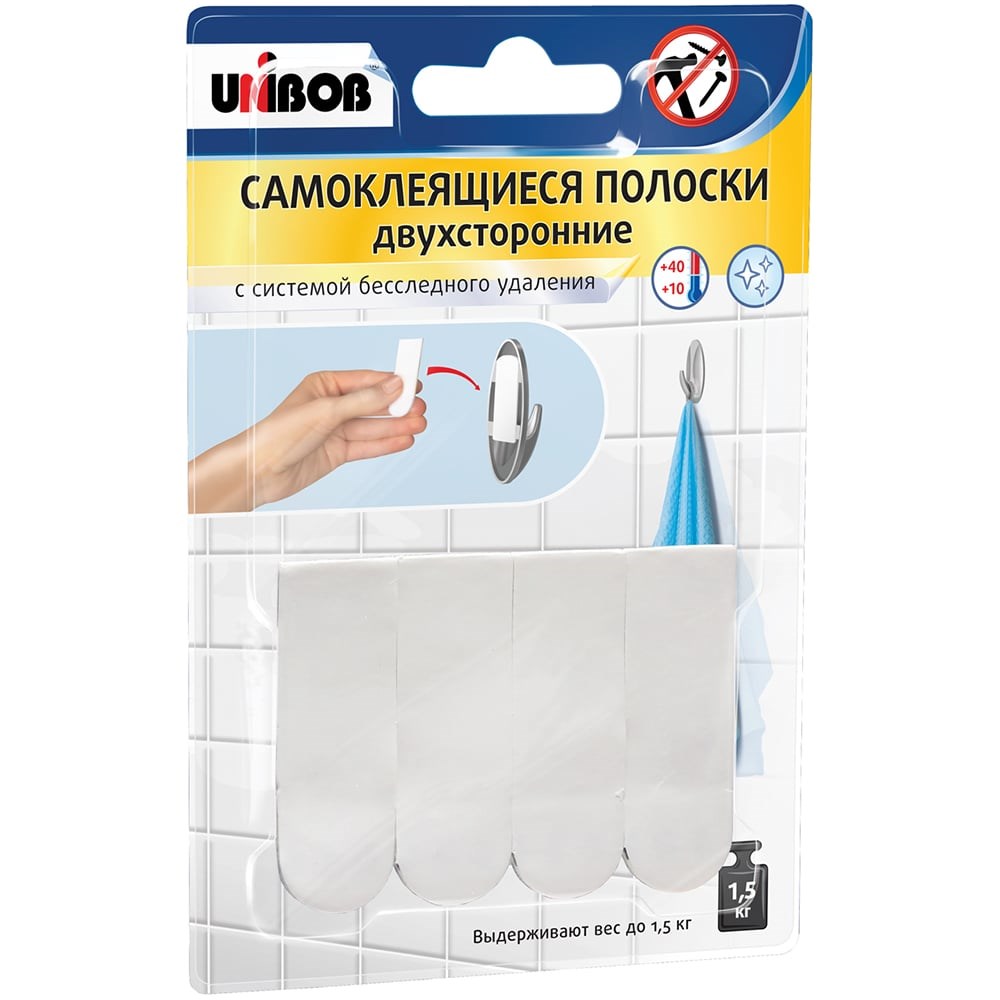 Двусторонние самоклеящиеся полоски Unibob белые, упак. 4 шт. 215022 предназначены для крепления изделий на деревянных поверхностях, кафельной плитке, невиниловых обоях, заштукатуренных стенах. Имеют широкий диапазон применения для работ внутри помещений. Обладают следующими характеристиками: Выдерживают вес изделия до 1.5 кг. Не оставляют следов после снятия. Клеевой слой на основе синтетического каучука обеспечивает надежное крепление к поверхности. Материал: вспененный полиэтилен.