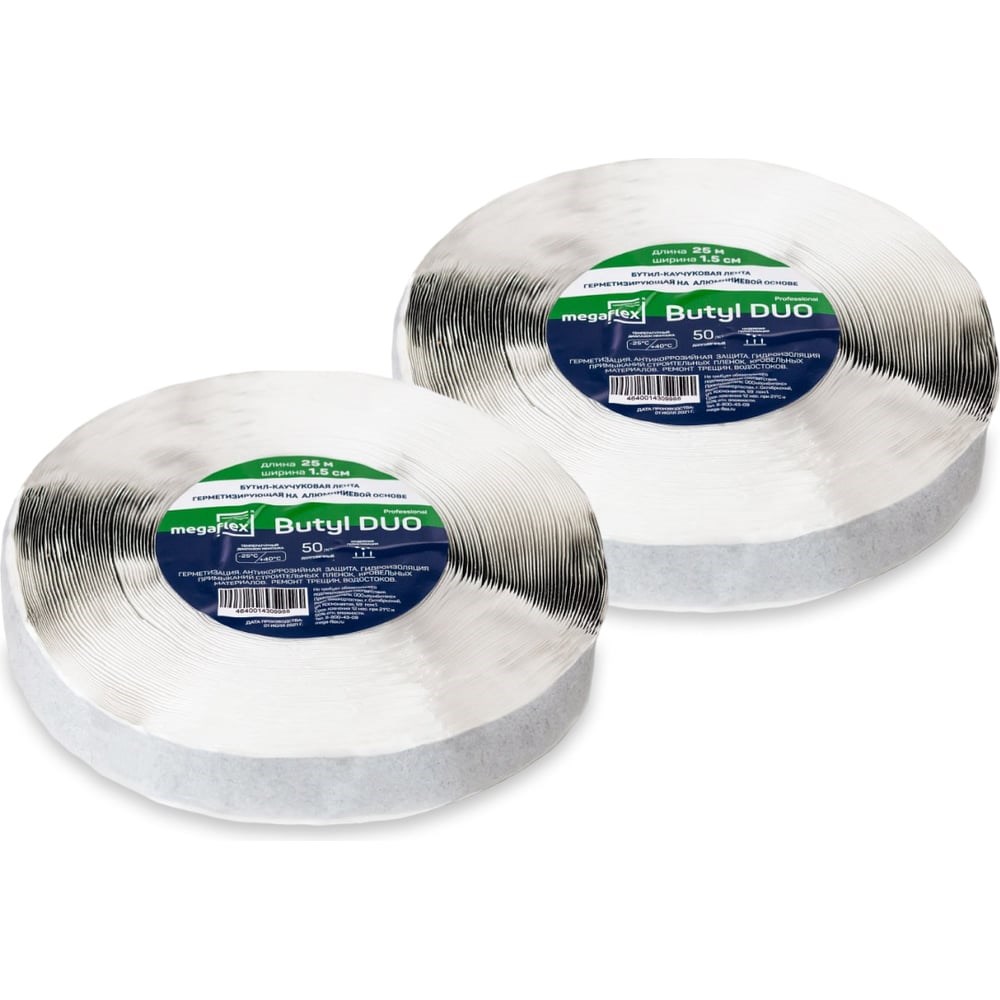 Двусторонняя бутил-каучуковая лента-герметик на алюминиевой основе Megaflex butyl duo (15 мм х 25 м), выгодная упаковка 2 шт. - безопасный строительный герметик. Лента двухсторонняя сохраняет адгезию, форму и свойства при экстремально низких и высоких температурах. Устойчива к влаге, ультрафиолету, резкому перепаду температур, химикатам.Высокая адгезия. Бутиловая лента демонстрирует отличную адгезию к металлу, древесине, бетону, пластику, стеклу, кирпичу, ондулину.Незаметная склейка. Идеален для незаметной склейки между собой двух плоскостей, подкровельных пленок пароизоляционного и мембранного типа, напольных покрытий и др.Экологичность. В отличие от битума, бутилкаучук экологически безопасен, не выделяет вредных веществ и неприятных запахов. Его можно использовать в жилых помещениях, например для заделки стыков между окнами, дверьми и стенами.Легкость монтажа. Бутиловая лента отлично монтируется без прогрева при температуре воздуха до −15 °С. Достаточно отклеить антиадгезионный слой и приложить ленту липкой стороной.Долговечность. Срок службы до 50 лет. В отличии от битума, который пересыхает и становится хрупким уже через полгода-год после монтажа, а при нагреве до 70 °С (например, на открытой кровле) начинает стекать, бутилкаучук не реагирует на температуру до 100 °С и сохраняет первоначальные качества.Применение:Для склеивания пленок и мембран в сложных местах и при повышенных нагрузкахГерметизация примыканий к дереву, бетону, металлу, пластикуРемонт трещин и проколов