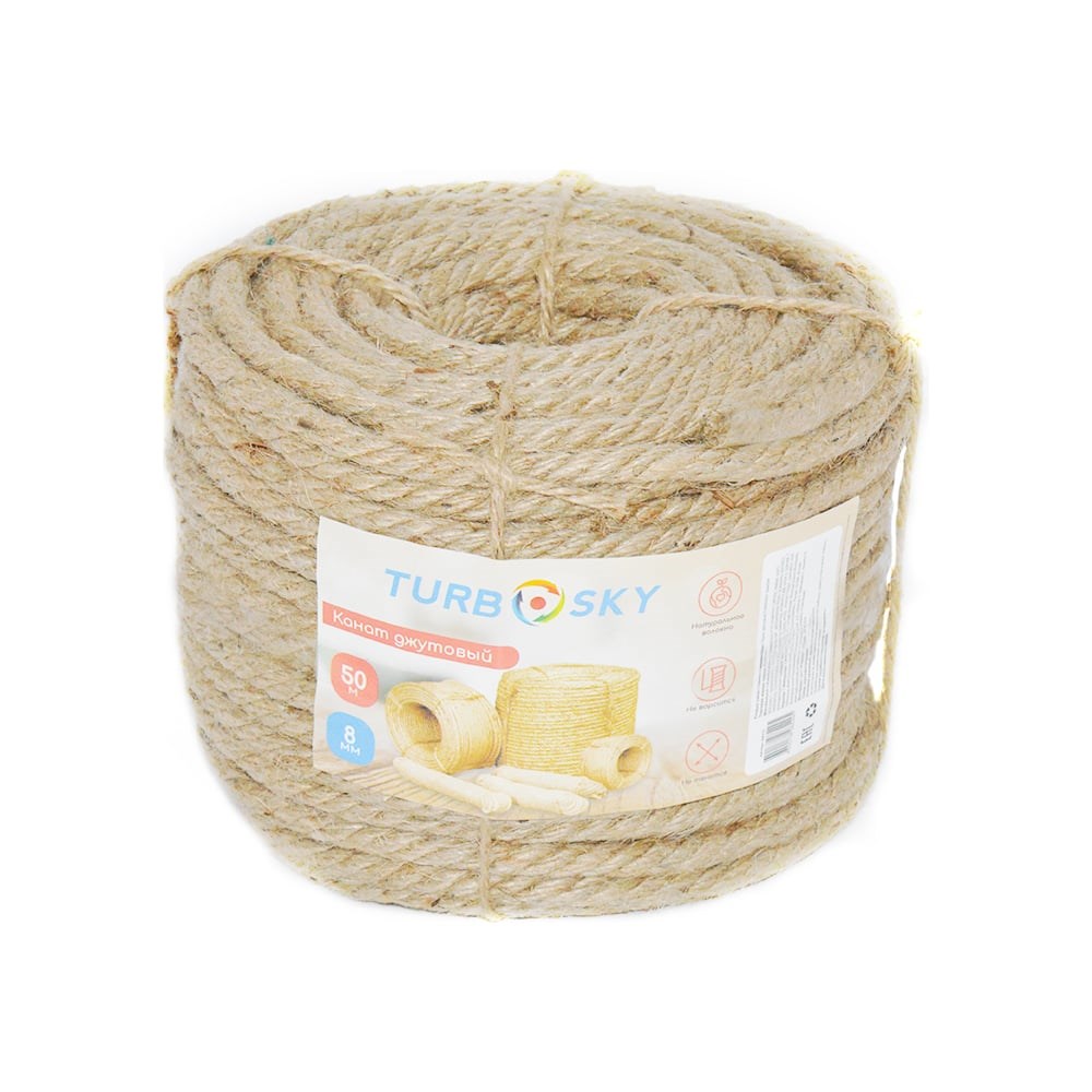 Джутовый канат Turbosky 8 мм, 50 м 1293_a изготовлен из натурального волокна джута. Благодаря высокому качеству материал не ворсится и не тянется. Канат имеет максимальную прочность и долговечность. У изделия высокое значение сопротивления на разрыв. Канат не подвергается процессам гниения и является стойким к сильным перепадам влажности и температуры. Незаменим для использования в доме и дачном хозяйстве. Является универсальным материалом для рукоделия, декорирования помещений, отделки интерьера, ремонте, при пошиве сумок, шторных композиций.