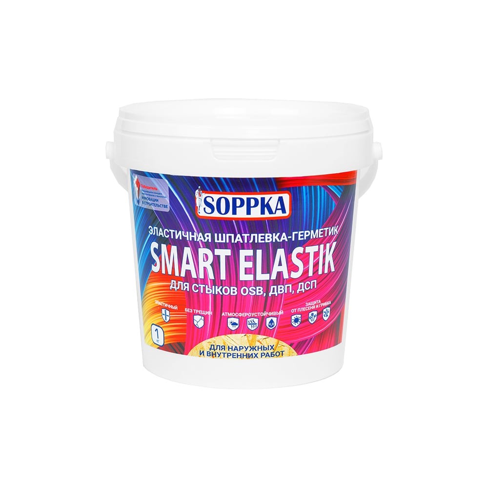 Эластичная шпатлевка-герметик для OSB SOPPKA SMART ELASTIK 1кг СОП-Шов1 применяется для заполнения стыков и затирки швов OSB-плит, SIP, ДВП, ДСП, листов фанеры, межбревенных и межвенцовых стыков сруба. Позволяет создать единую поверхность. Благодаря эластичности не растрескивается и выдерживает нагрузки по растяжению и сжатию в ходе эксплуатации. Предназначен для наружных и внутренних работ. Герметик предотвращает развитие грибка и плесени, а также защищает от проникновения влаги и холода. Наносится шпателем или с помощью специальной насадки. Используя эластичный герметик, можно приклеить плитку, кафель или другие декоративные элементы.РАСХОД: Зависит от толщины и ширины шва между плитами. При ширине стыка 3-5 мм расход на 1 (один) погонный метр шва составляет 100-150 г.Работы проводить при температуре не ниже +5 ºС и относительной влажности воздуха не более 65%. Время высыхания при температуре 20 ºС и относительной влажности 65% составляет 10-12 часов. При более низких температурах время высыхания увеличивается. Дальнейшие работы следует производить не ранее, чем через 7 суток после нанесения SOPPKA SMART ELASTIK.