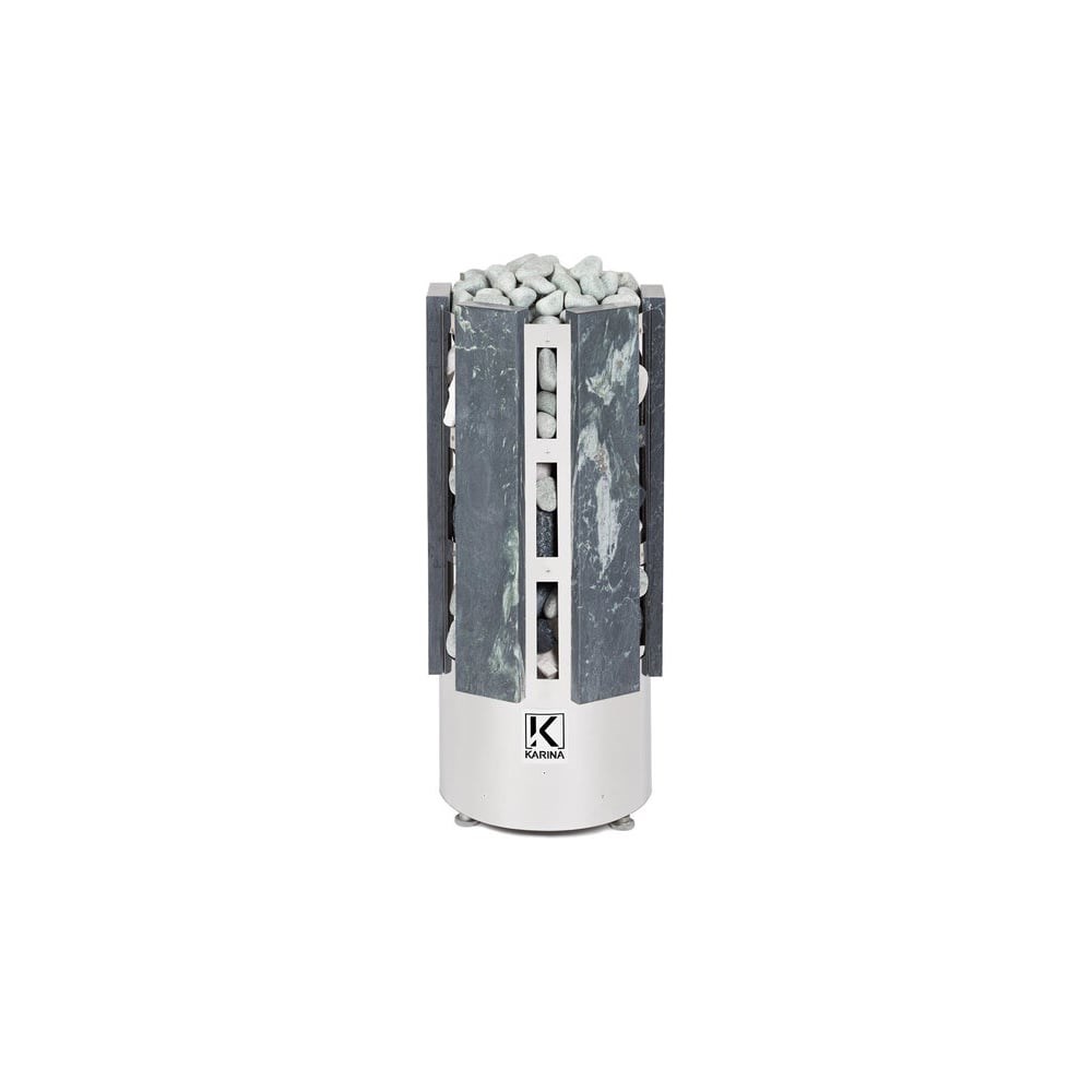 Электрокаменка Karina Forta 10 Талькохлорит предназначена для парных объемом до 14м3. Печь выполнена в напольном варианте и обладает цилиндрической формой дополненной плитами из натурального камня Талькохлорита. Напряжение питания - 380В. Данная модель имеет 3 тэна, расположенных в виде треугольника. В центре внизу расположен бак для воды емкостью 3 л, который является парогенератором. Выше парогенератора имеется емкость под мелкие камни или нержавеющие шары объемом 2.5 л, вмещающая 5 кг мелкого камня, называемая закрытой каменкой с воронкой для подачи воды и получения мелкодисперсного пара. Электрическая печь Karina Forta 10 Талькохлорит многофункциональна, и при правильной эксплуатации она подойдет для любителей как финской сауны, так и русской бани.Если в парогенератор не заливать воду, то каменка разогреет парную до высокой температуры (100 -120°C) с относительной влажностью воздуха 10-12% - режим сухой бани (финская сауна). Если залить воду в парогенератор, то при разогреве парной вода будет испаряться и увлажнять воздух до режима русской бани (60-70°C и 40-50% влажности).Управление электропечью осуществляется с помощью выносного пульта, который не входит в комплектацию и приобретается дополнительно.Все корпусные элементы печи выполнены из нержавеющей стали. Нагревательный элемент - ТЭН диаметром 10мм. Наружный кожух каменки дополнительно облицован плитами из Талькохлорита толщиной 40мм, что придает ей еще большую теплоемкость.