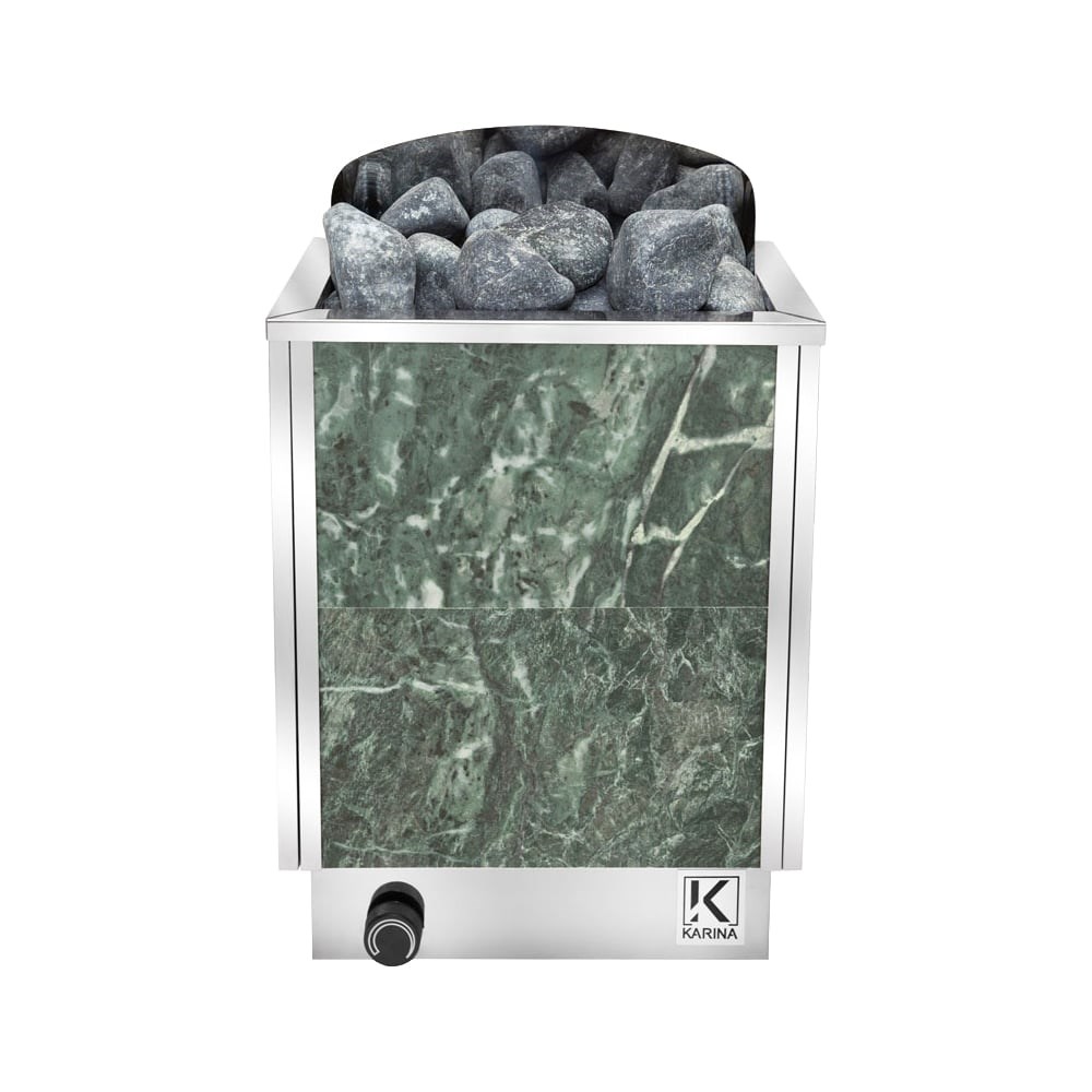Электрическая печь Karina Trend 6 Змеевик Tr-6-220/380-Z подходит для обогрева домашних бань и саун объемом от 7 до 9 куб.м. Для удобной эксплуатации в комплект поставки входит встроенный пульт управления. С помощью него пользователь легко может регулировать температуру нагрева воздуха. Облицовка из змеевика придает устройству стильный и современный вид.
