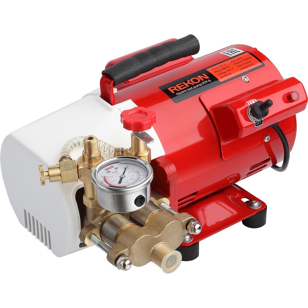 Электрический опрессовщик REKON RTP-6 023061 предназначен для испытания давлением резервуаров, гидравлических систем и систем отопления. Работает с максимальным давлением 60 бар. Удобен в переноске благодаря эргономичной ручке. Имеет манометр, что позволяет контролировать давление.
