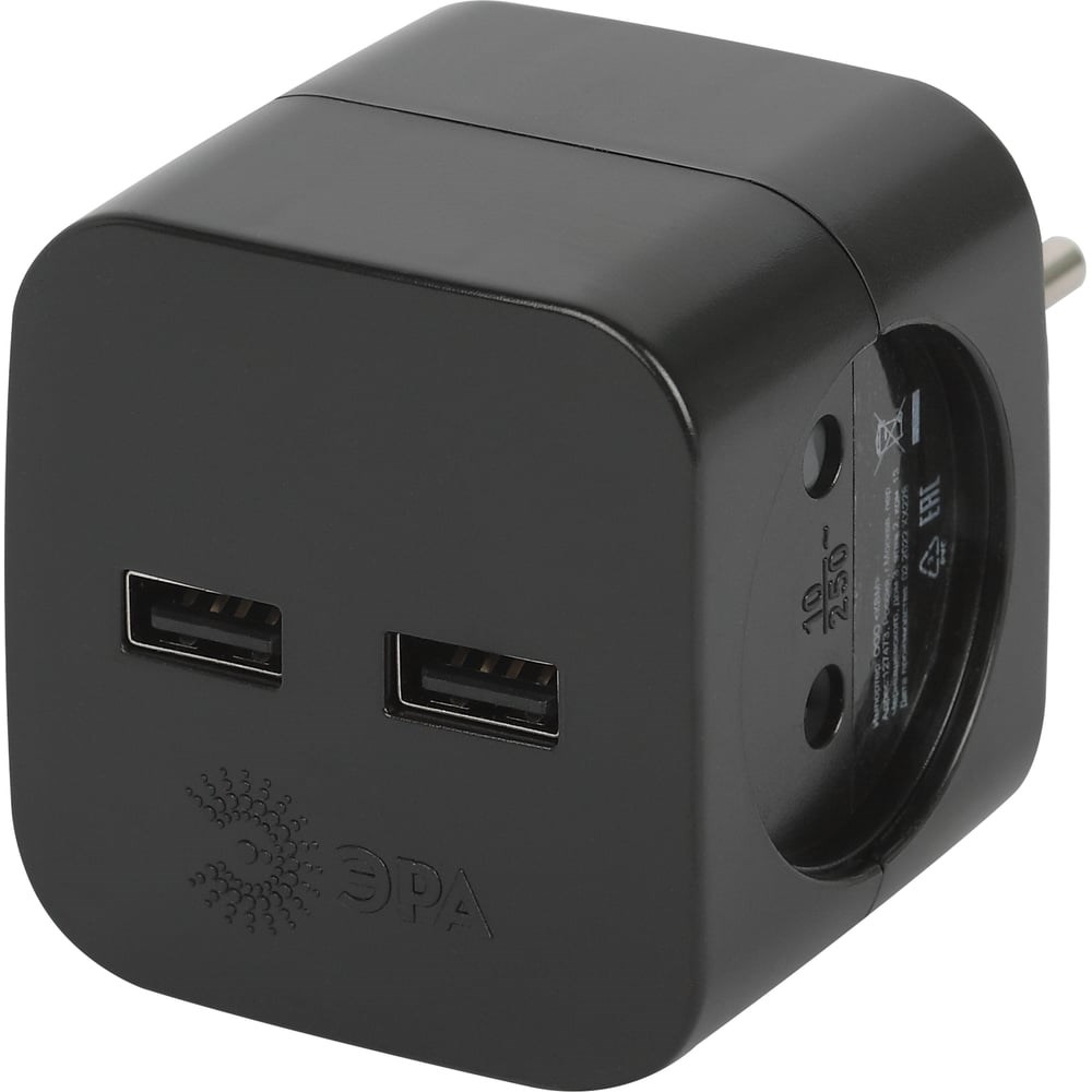 Электрический разветвитель ЭРА SP-2-USB-B на 2 розетки, 220V + 2xUSB 2400mA, без заземления, 10А, черный Б0049535