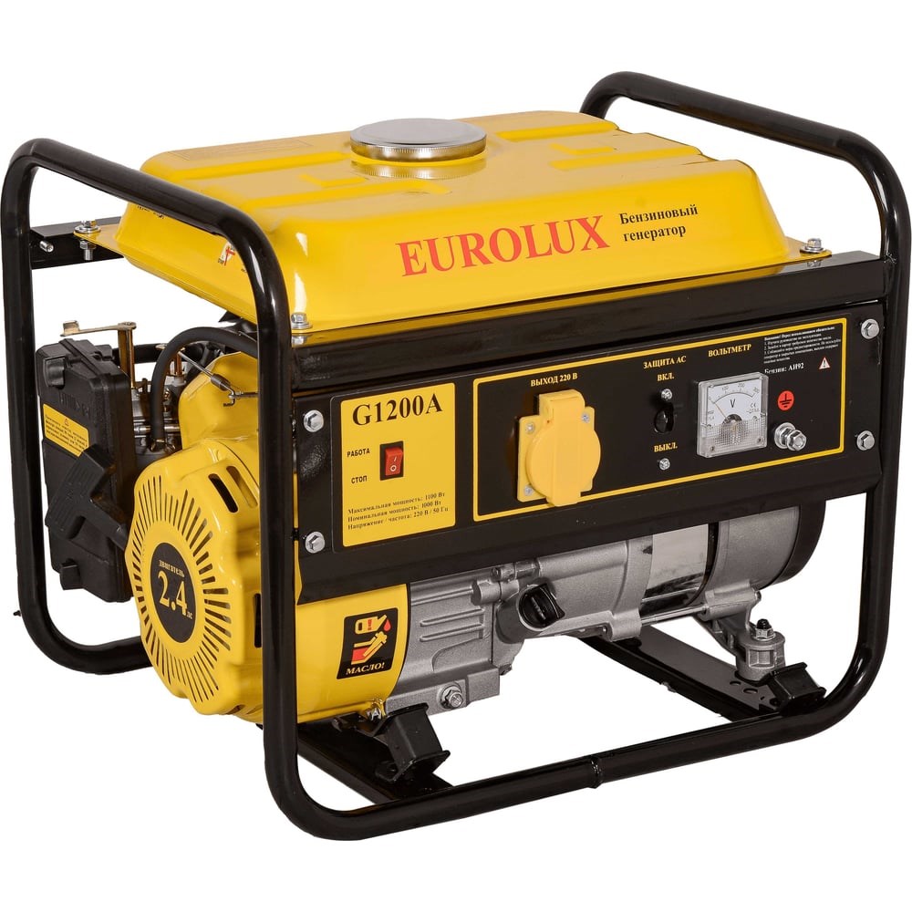 Электрогенератор EUROLUX G1200A используется в целях подключения бытовых устройств к сети на объектах без доступа к ней. Можно считать его как основным, так и запасным источником электропитания, функционирующим на неэтилированном бензине АИ-92. Характеристики EUROLUX G1200A: Максимальный уровень мощности: 1100 Вт, Генератор на выходе выдает напряжение 220 В, частота переменного тока составляет 50 Гц, Номинальная мощность двигателя – 2,4 л.с, Ёмкость бензобака 6 литров. В генераторе предусмотрена защита от перегрузки, которая сохраняет оборудование, а также защита от короткого замыкания. Предполагается и сбережение конструкции от недолива или отсутствия масла, при низком уровне технической жидкости – двигатель не включается. Резиновые подкладки, расположенные в нижней части конструкции, защищают от отрицательного действия вибрации бензогенератора, в связи с чем повышается устойчивость оборудования к дополнительным нагрузкам и факторам. Трехконтурная система защиты способствует продлению сроков эксплуатации.