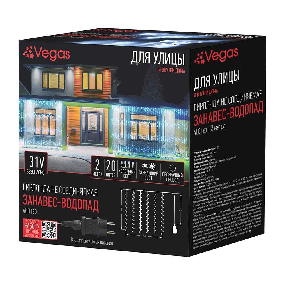 Электрогирлянда VEGAS занавес-водопад, 31V, 400 холодных LED ламп, 55139 не соединяемая, стекающий свет.Гирлянда не соединяемая, стекающий свет. Размер гирлянды 200*200 см, длина провода 500 см. Кол-во нитей 20.Кол-во светодиодов 400. Цвет сечения холодный. Режим сечения :2 режима (стекание/постоянный). Цвет провода прозрачный.Степень защиты IP44. Температурный режим от -30 до +50, и относительной влажностью 80%. Мощьность 6W.Срок службы 25000 часов.
