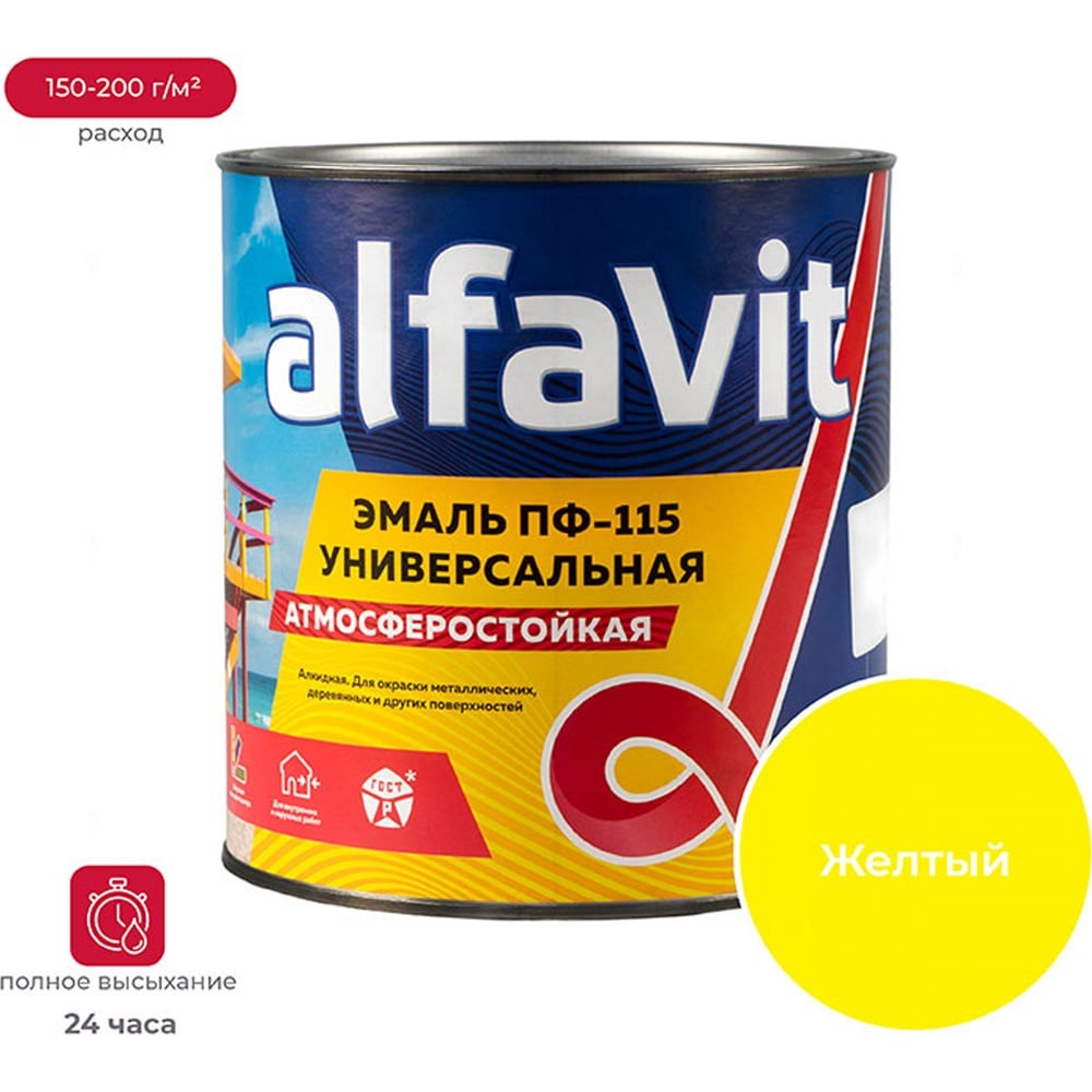 Предназначена для окраски деревянных , металлических и других поверхностей, подвергающихся атмосферным воздействиям, и для окраски внутри помещений (оконные рамы, двери, кирпичные и бетонные поверхности, ДВП, ДСП). Расход: 150-200 г/м² на однослойное покрытие в зависимости от цвета эмали. Время высыхания: 24 часа. Срок годности: 547 суток. Желтый Эмаль ПФ-115 универсальный строительный лакокрасочный материал на основе алкидного лака. Обладает адгезией к различным типам поверхности. Устойчива к изменению температуры от -30°С до +30°С.